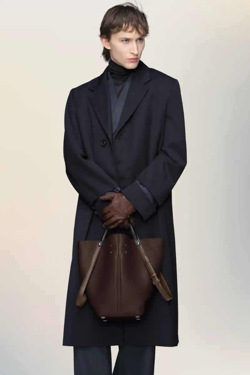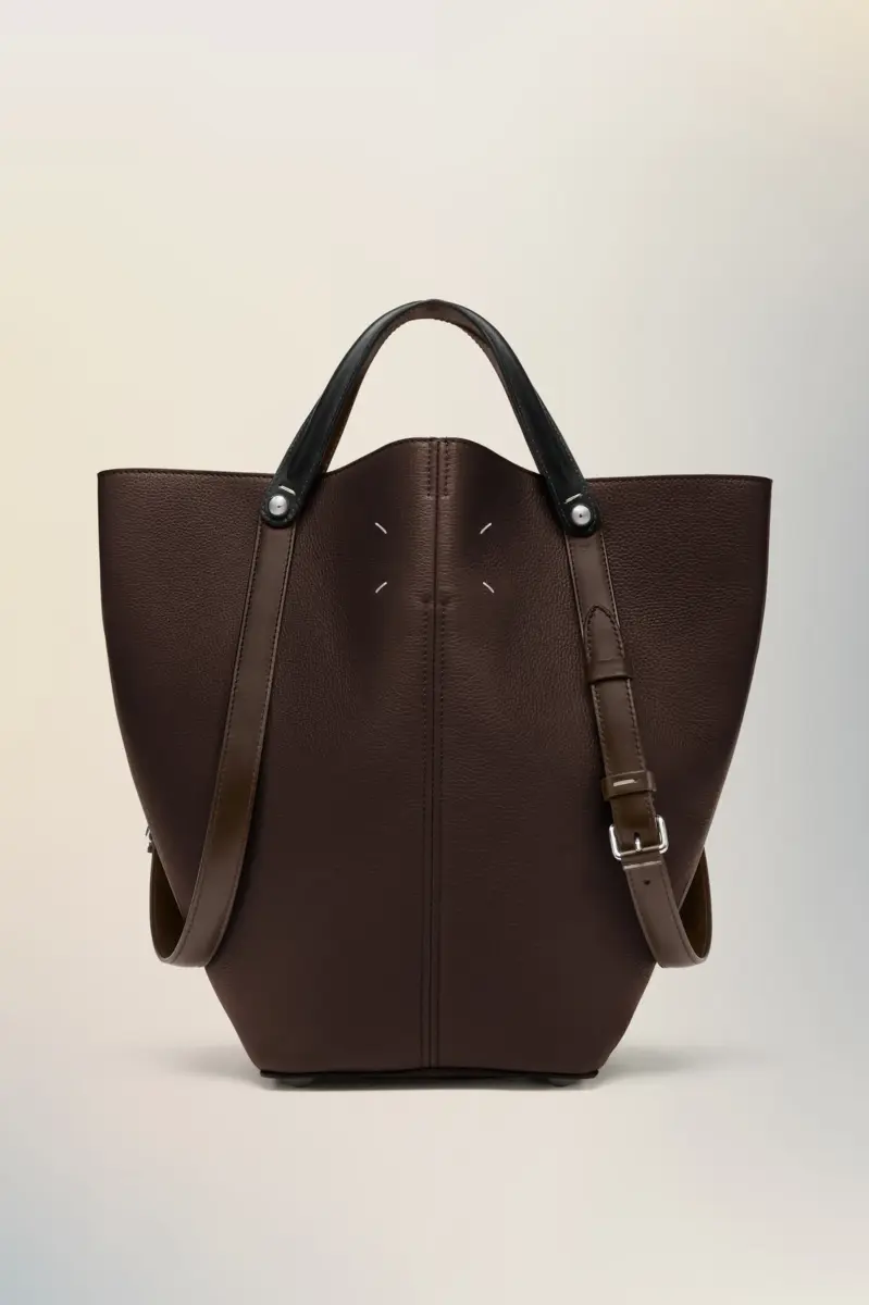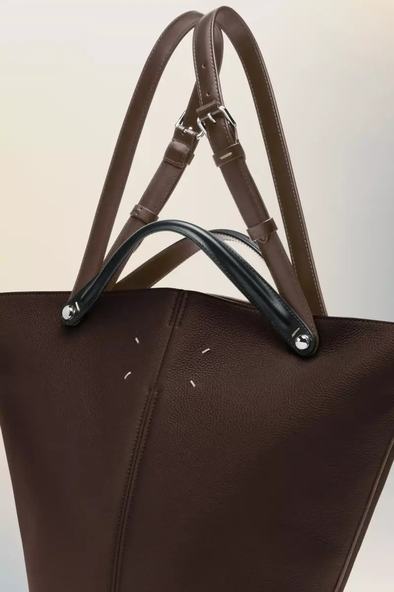 La Maison lanza el bolso Dress-age para la temporada Primavera/Verano 2025, elaborado en suave piel de becerro granulada. Con un toque ecuestre, este bolso mediano luce una marroquinería clásica y líneas refinadas, combinando un glamour discreto con un diseño gestual. Su forma trapezoidal presenta un detalle de correa doble en contraste. La base con tachuelas permite que el bolso se mantenga de pie, y el interior está adornado con el logotipo. Las cuatro puntadas, la firma de Maison Margiela, aparecen en la parte trasera. Lo opuesto a una etiqueta.