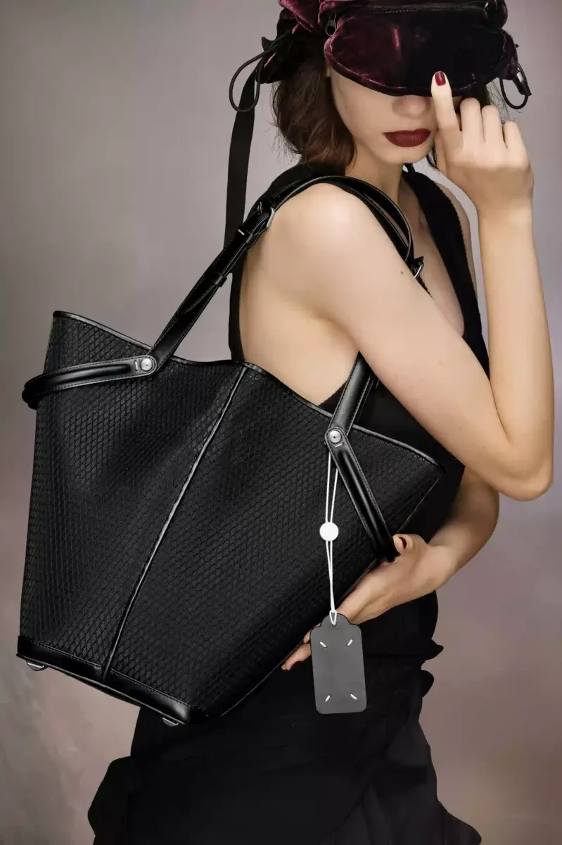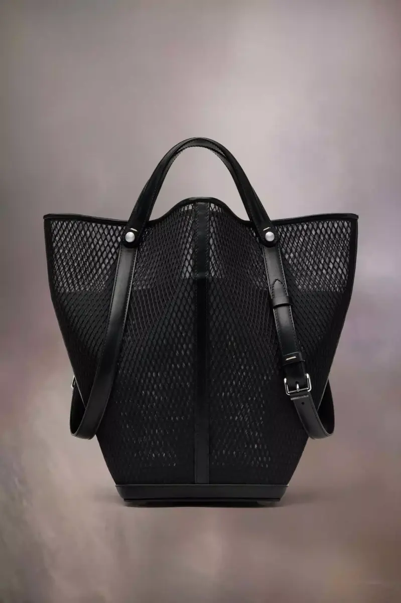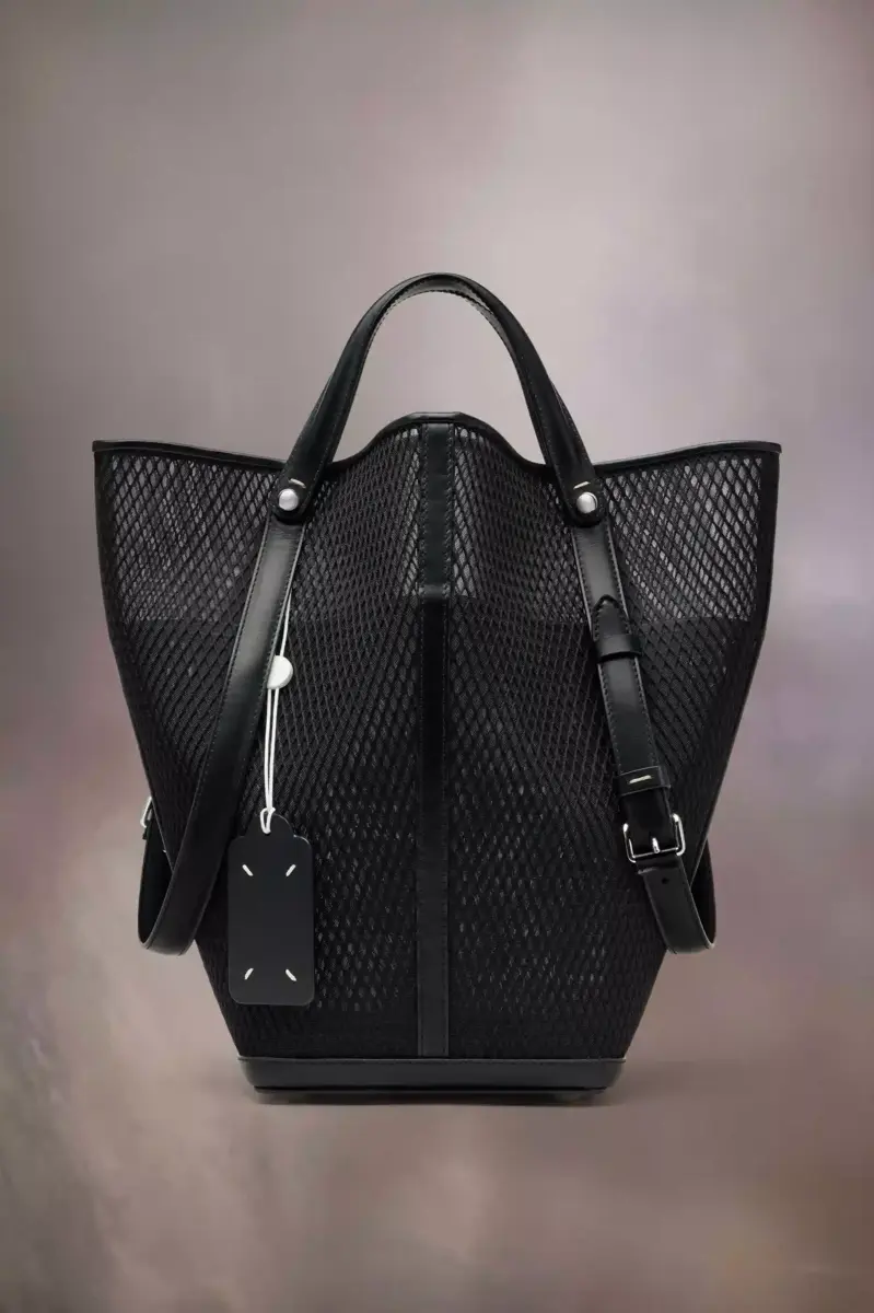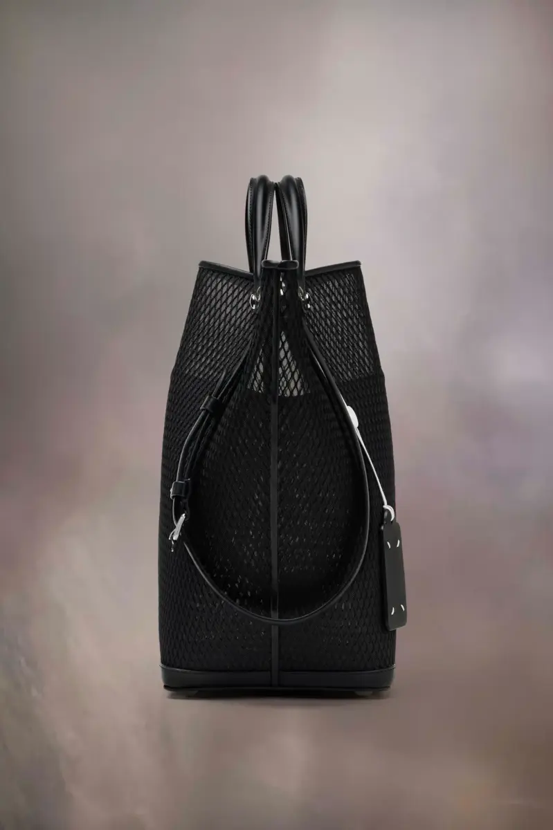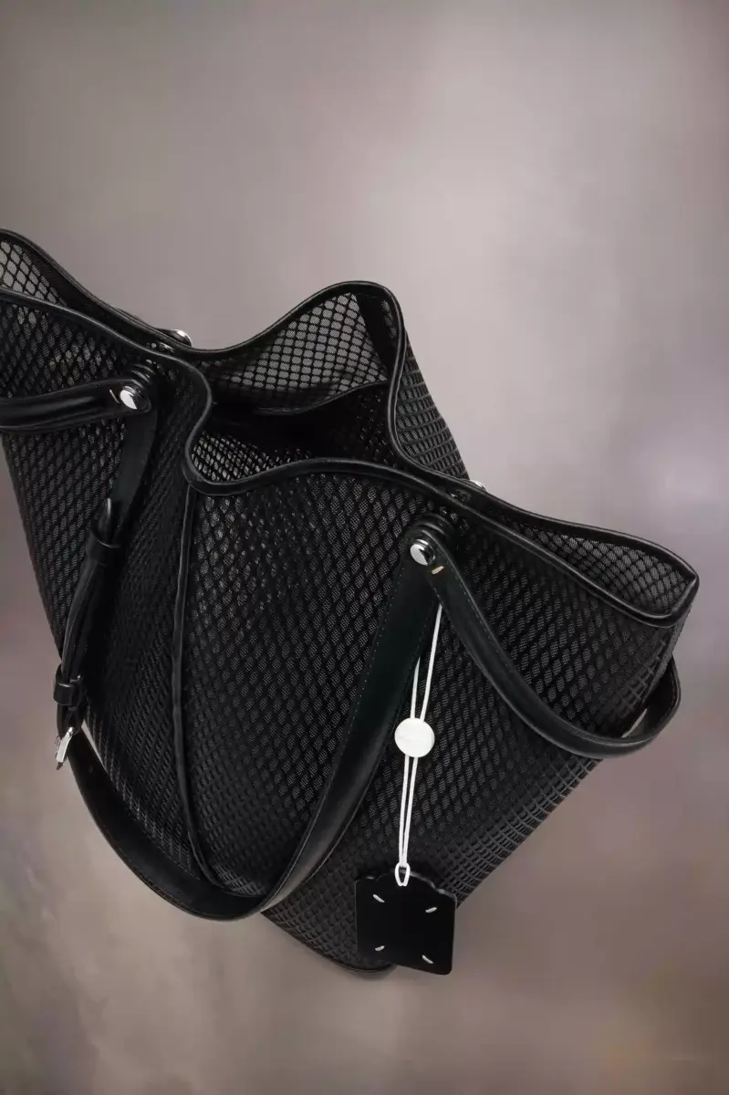 La Maison lanza el bolso Dress-age para la temporada primavera/verano 2025, elaborado en piel de becerro con una capa de red. Con un toque ecuestre, este bolso mediano se inspira en las ceremonias de la doma clásica. Presenta un diseño trapezoidal con detalle de correa corta, que puede llevarse como asa superior o plegada para simular estribos, con las correas más largas y ajustables con hebilla para llevar al hombro. La base está tachonada, lo que permite que el bolso se mantenga de pie, y el interior está decorado con el logotipo. Presenta una etiqueta con el logotipo y un cordón en contraste. Las cuatro puntadas, la firma de Maison Margiela, aparecen en el lateral. Lo opuesto a una etiqueta.