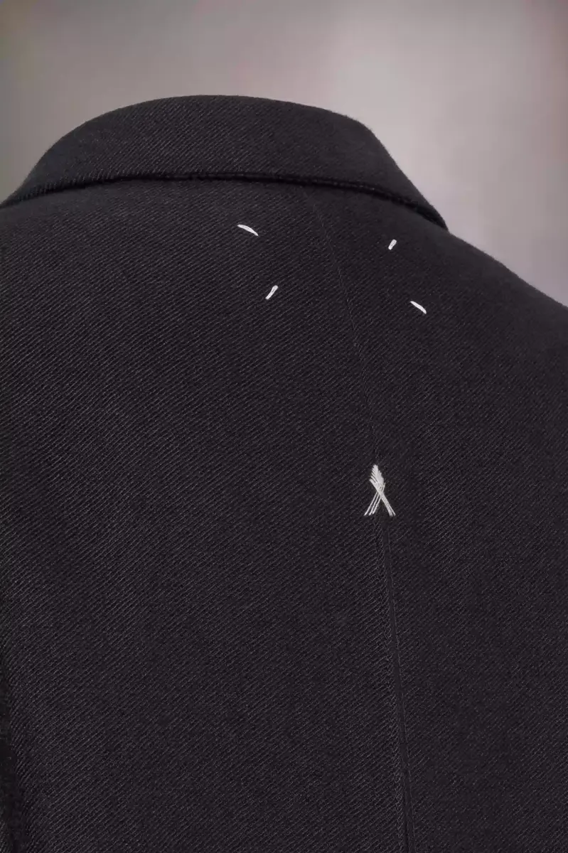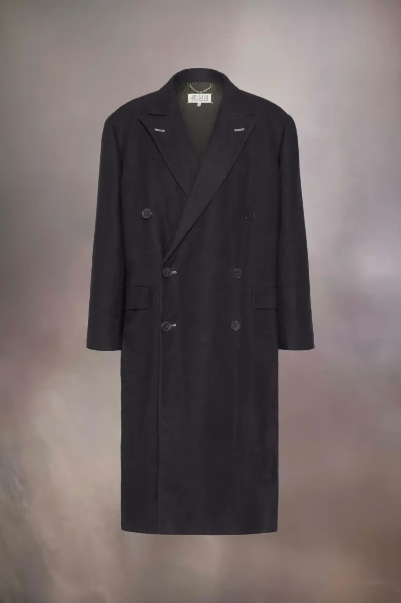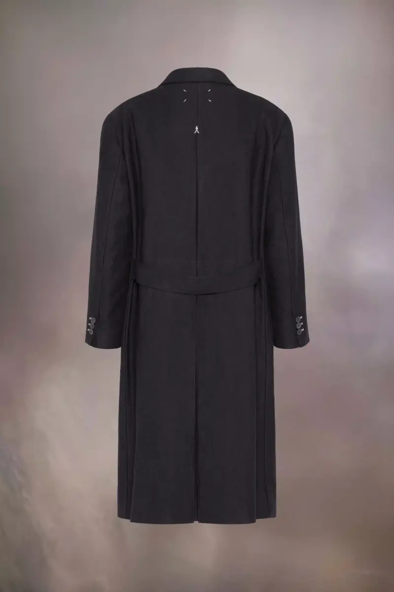 Inspirado en la clásica ropa de abrigo de caballero, este abrigo largo tejido en mezcla de lino y lana presenta una silueta oversize que le confiere un toque de estilo informal. Se aprecian puntadas en proceso de elaboración en contraste, con cinturón en la espalda y pliegue invertido, frente cruzado y bolsillos de solapa. Las cuatro puntadas, el sello distintivo de Maison Margiela, aparecen en la espalda. Lo opuesto a una etiqueta.