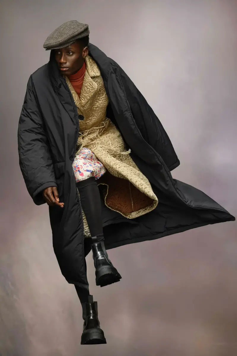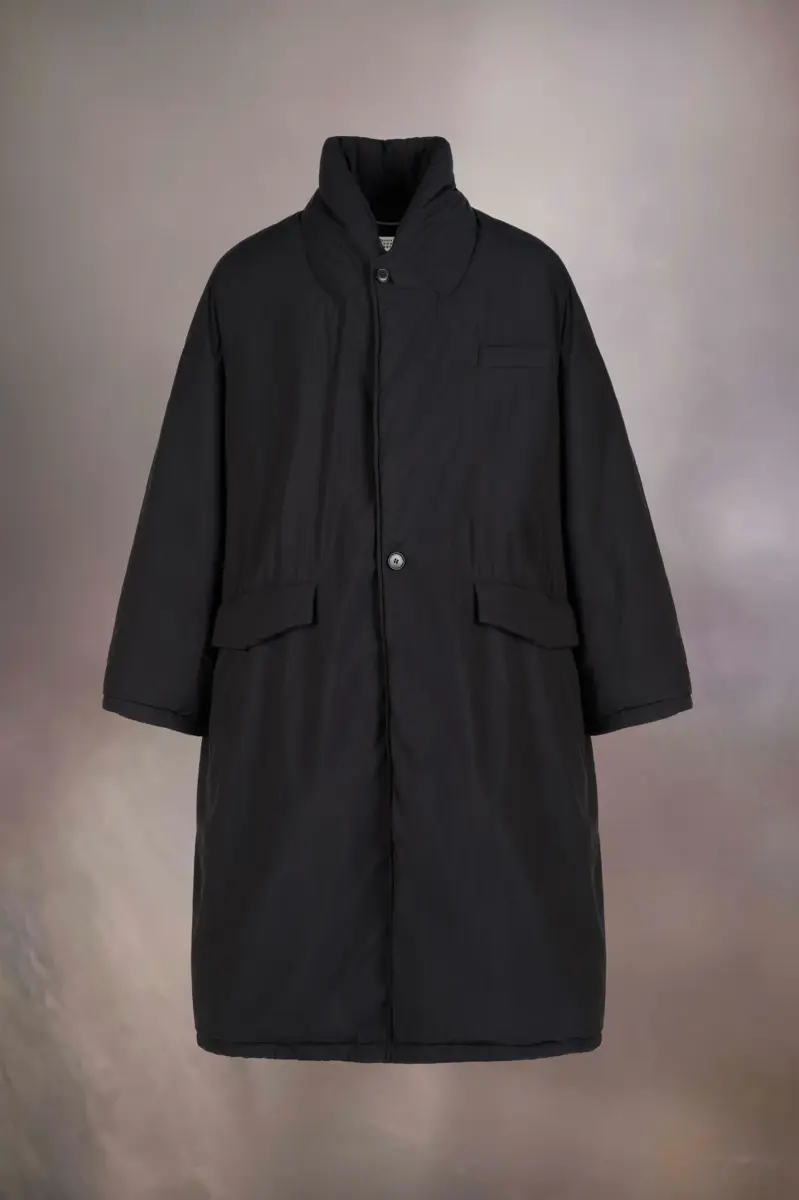 Este abrigo acolchado extragrande de largo medio está confeccionado en tela reciclada, con cuello alto y abertura en la espalda. Las cuatro puntadas blancas, el sello distintivo de Maison Margiela, aparecen en la espalda; lo opuesto a una etiqueta.