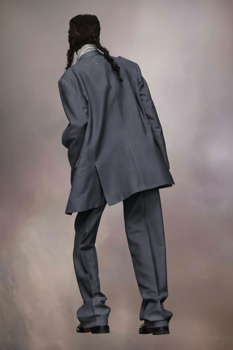 El blazer con cuello de muesca está confeccionado en una mezcla de lana y mohair con una técnica de pátina grasa aplicada a mano para lograr un acabado desgastado e irregular. Con cierre de botonadura sencilla, la chaqueta cuenta con un bolsillo en el pecho, bolsillos con solapa y no tiene abertura trasera para una silueta impecable. Las cuatro puntadas, la firma de Maison Margiela, aparecen en la espalda. Lo opuesto a una etiqueta.
