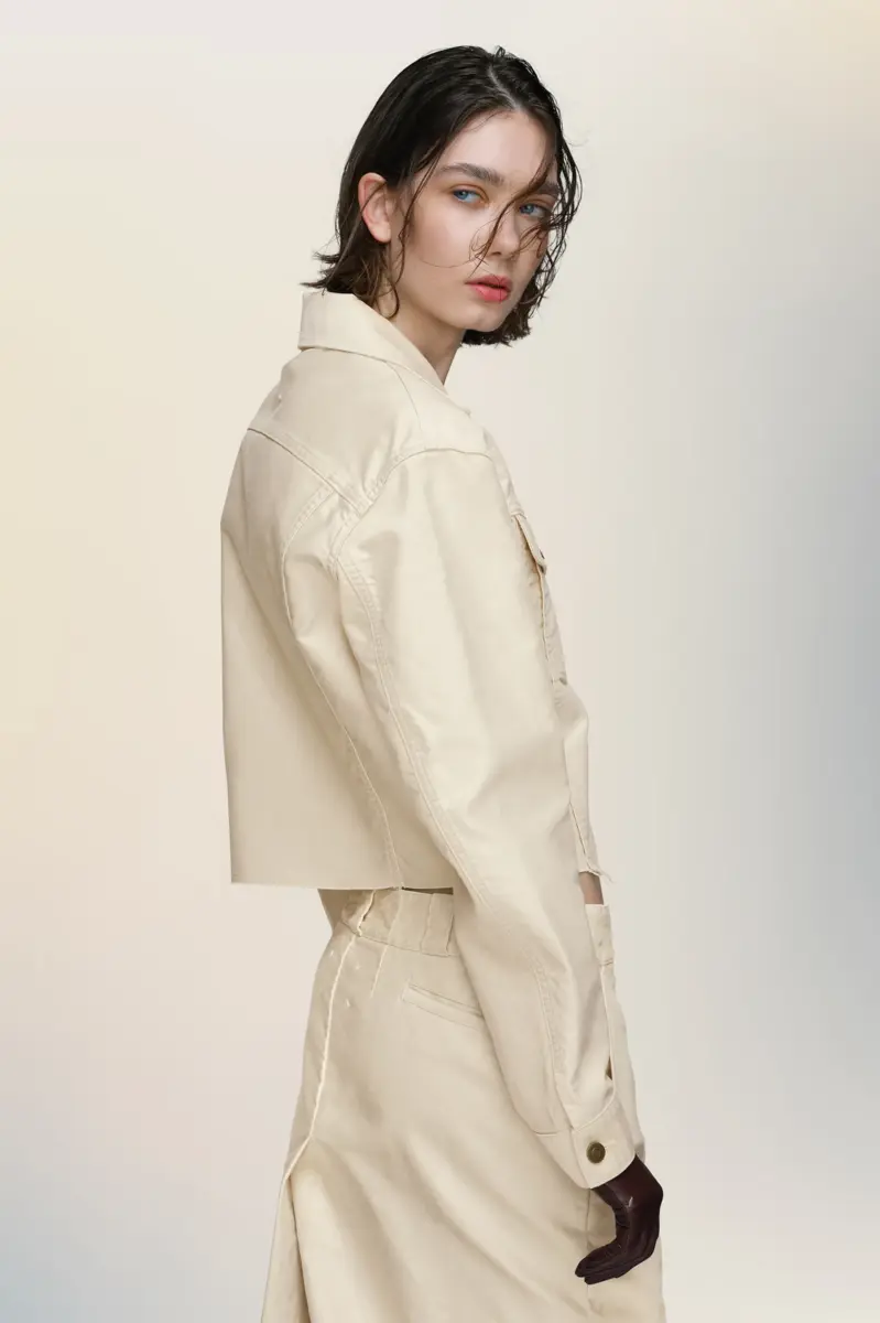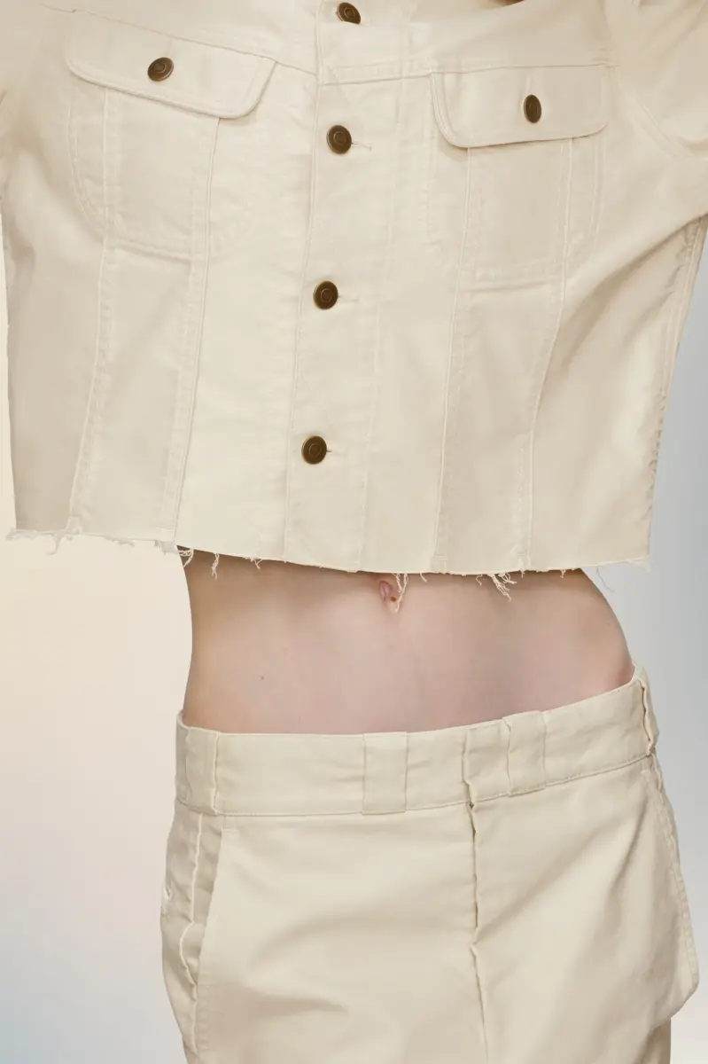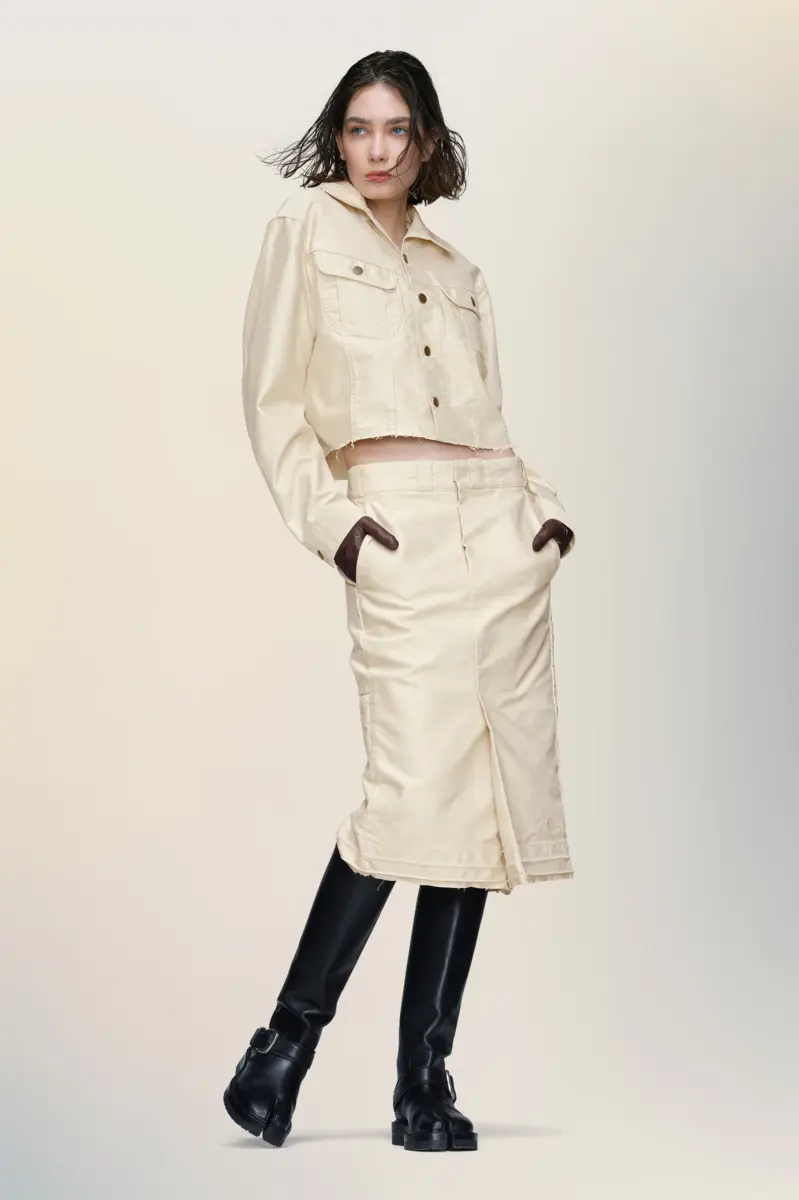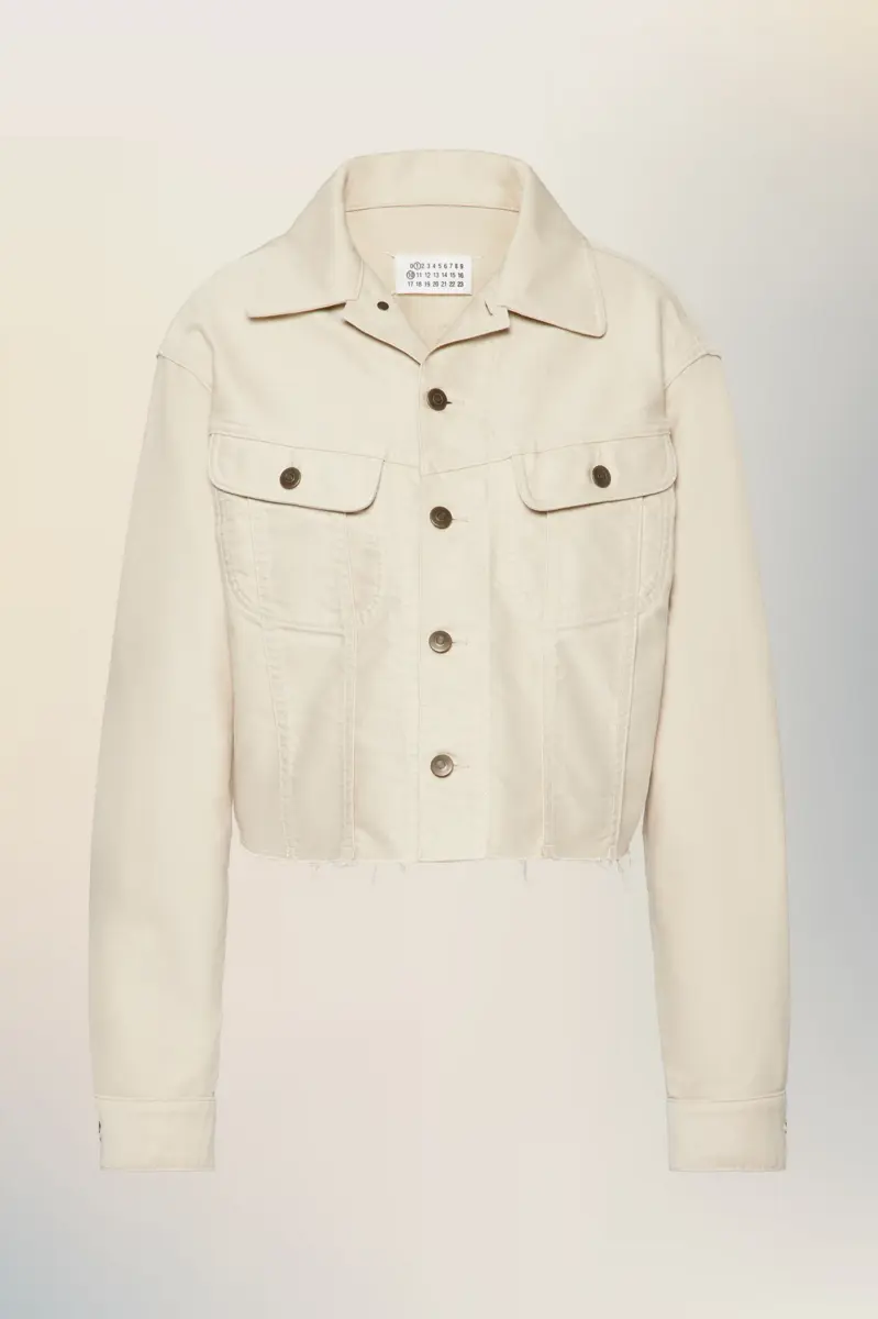 Confeccionada en molesquín de algodón, esta chaqueta corta plasma el enfoque deconstructivo de la Maison en una silueta concisa. Los dobladillos sin rematar y las costuras visibles reinterpretan la ropa de trabajo clásica con proporciones modificadas y un acabado minimalista. Las cuatro puntadas, el sello distintivo de Maison Margiela, aparecen en la espalda; lo opuesto a una etiqueta.