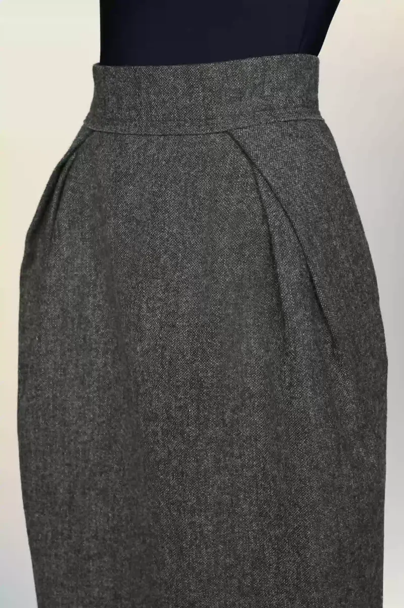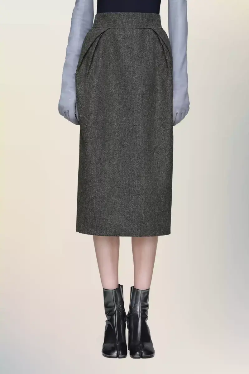 Confeccionada en lana gruesa con una suave textura de espiga, esta falda midi presenta pliegues frontales estructurados que crean volumen en la cadera. Una cintura alta enmarca la silueta, resaltando su sutil forma arquitectónica. En la espalda, lucen las cuatro puntadas características de la Maison; lo opuesto a una etiqueta.