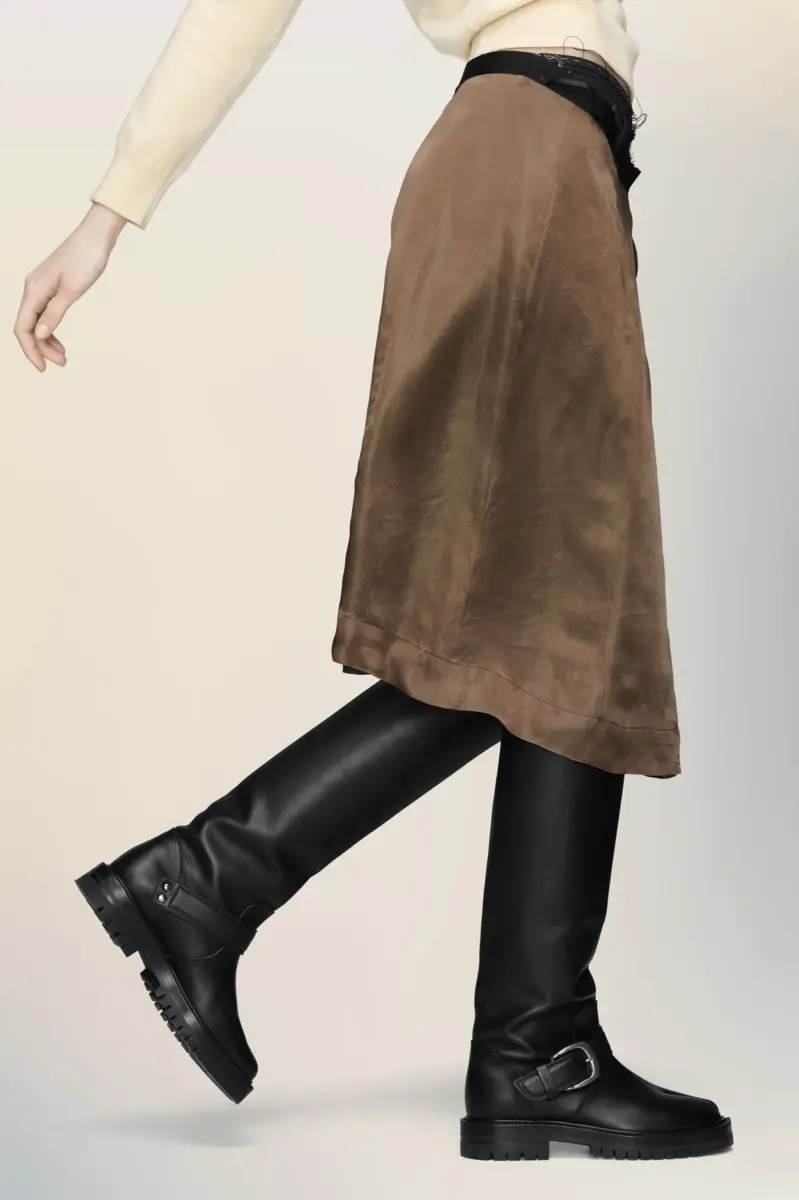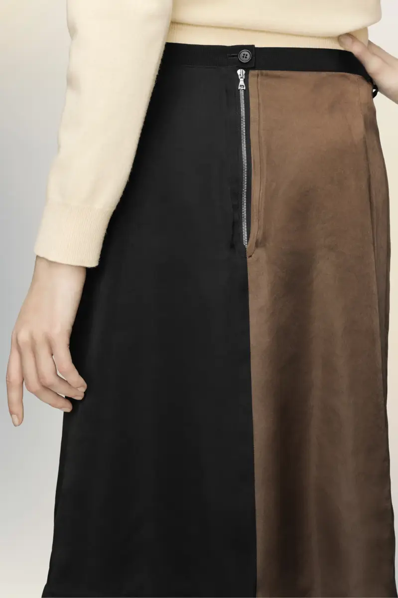 Confeccionada con paneles en contraste y una cinturilla interior a la vista, esta falda midi juega con la idea de funcionalidad y reversibilidad. Diseñada para múltiples usos, invita a experimentar con el estilo y la silueta. El diseño «Anonymity of the Lining» de Maison Margiela revela su interior.
