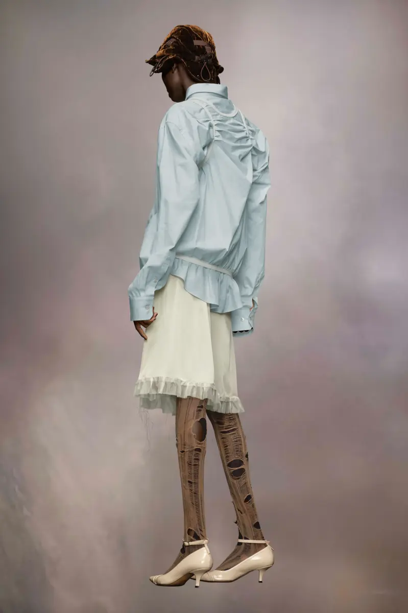 La camisa está confeccionada en algodón, con un cuello elegante clásico, botones centrales y un bolsillo en el pecho. Los puños están abotonados y tiene un dobladillo curvo. Para realzar la silueta, se incorpora un ribete en forma de camiseta de tirantes Décortiqué alrededor de los hombros y en el dobladillo, creando un efecto fruncido. Las cuatro puntadas, el sello distintivo de Maison Margiela, aparecen en la espalda; lo opuesto a una etiqueta.