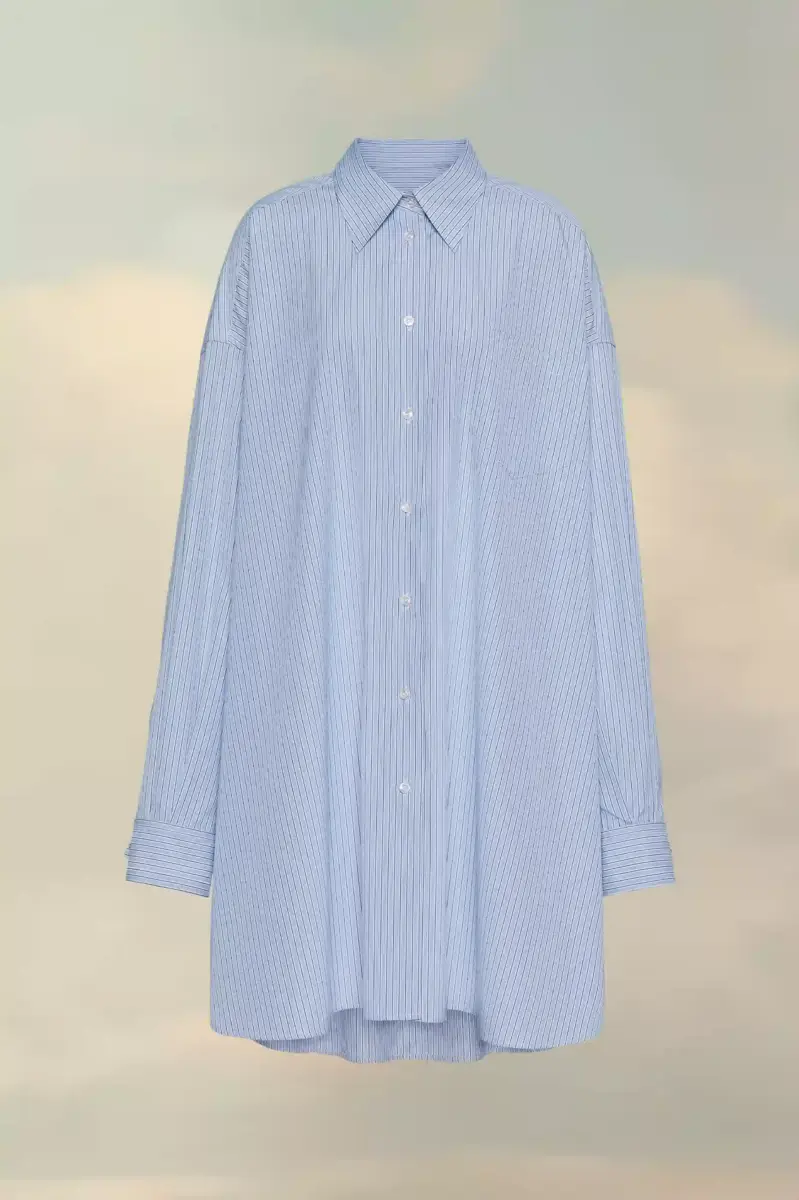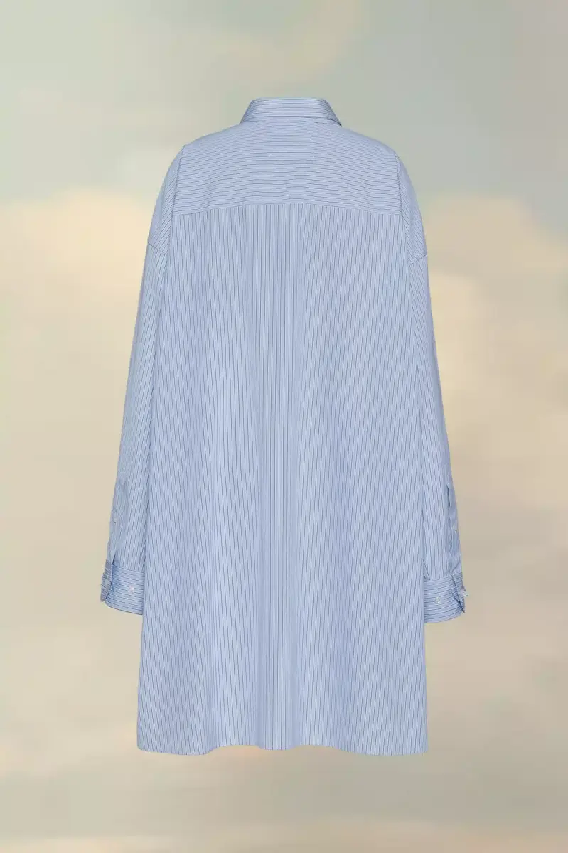 Camisa clásica de popelina de algodón de raya diplomática, con cuello, tapeta abotonada y bolsillo en el pecho. En la espalda, cuatro puntadas blancas muestran la firma de la Maison: lo opuesto a una etiqueta.