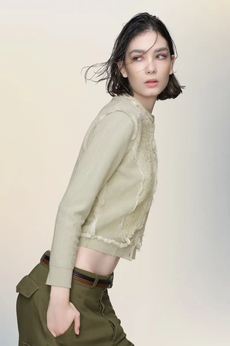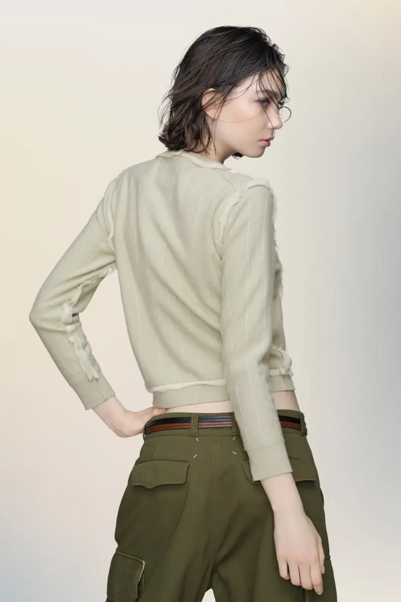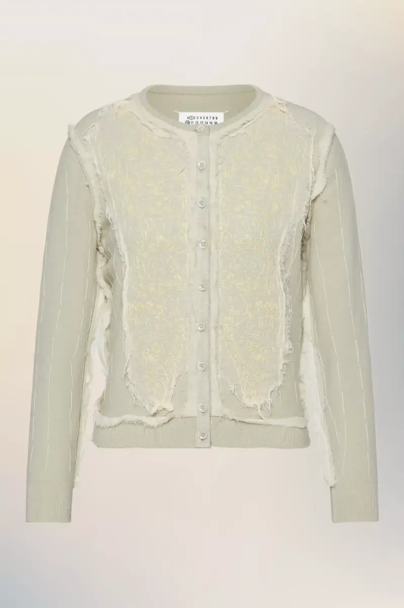 Este cárdigan se presenta enmarcado por el contraste, con parches que simulan el reverso de una tela delicadamente bordada. Las líneas verticales de puntada reflejan el interior de la prenda, en consonancia con el estilo décortiqué de la Maison. Las cuatro puntadas, el sello distintivo de Maison Margiela, aparecen en la espalda; lo opuesto a una etiqueta.