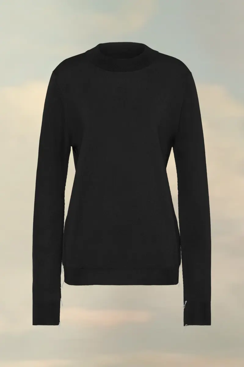 Con las puntadas «Work in Progress» de la Maison en los hombros e hilos sueltos para una estética inacabada, este clásico jersey de cuello redondo está confeccionado en fina lana merino. Las cuatro puntadas, el sello distintivo de Maison Margiela, aparecen en la espalda; lo opuesto a una etiqueta. Galga 18.
