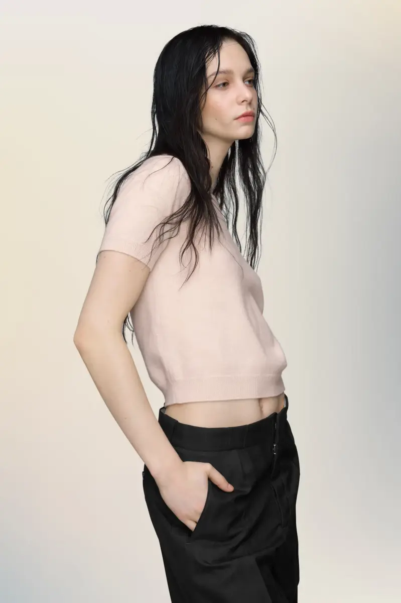 Combinando suavidad y estructura, este top de lana de cordero es una expresión fresca de feminidad clásica. Lavado para un acabado desgastado, su forma minimalista se equilibra con un delicado color tonal y una ligereza agradable al tacto. Las cuatro puntadas, el sello distintivo de Maison Margiela, aparecen en la espalda; lo opuesto a una etiqueta.