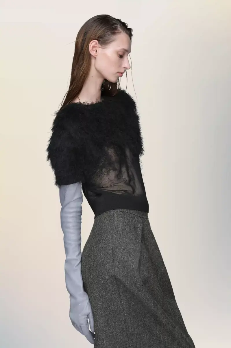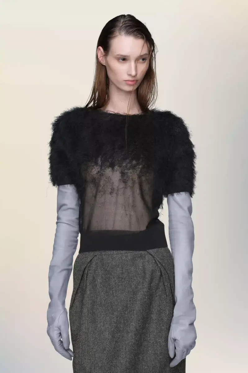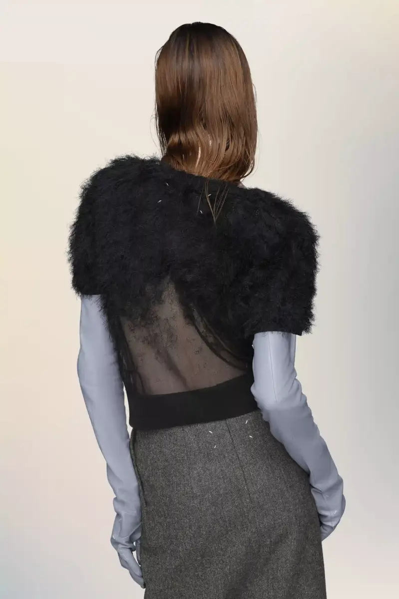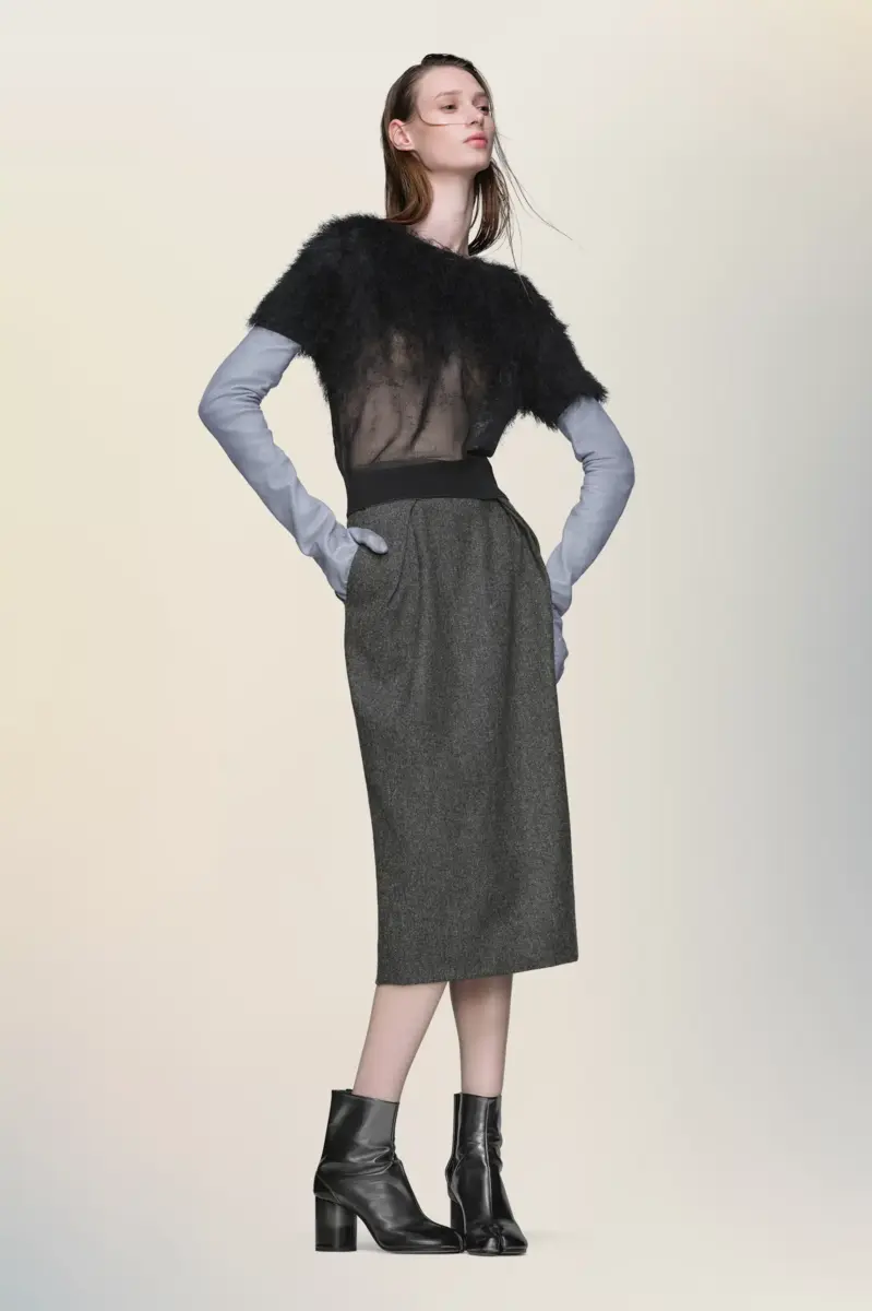 Este top de manga corta está confeccionado en punto de seda con un acabado texturizado que se difumina en el cuerpo, una expresión de la técnica retrograding de la Maison. La cinturilla acanalada y el cuello redondo crean un elegante contraste con la superficie vaporosa. En la espalda, aparecen las cuatro puntadas características de la Maison; lo opuesto a una etiqueta.