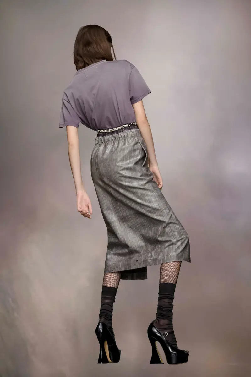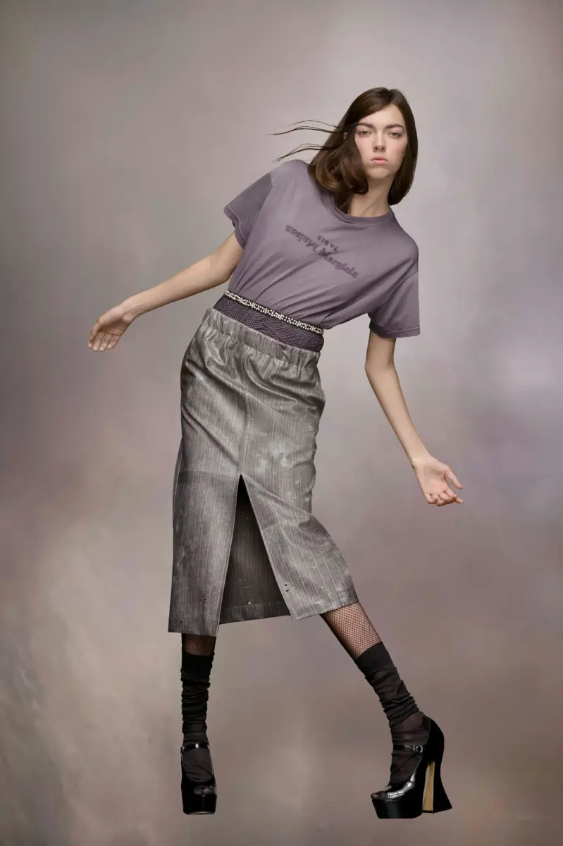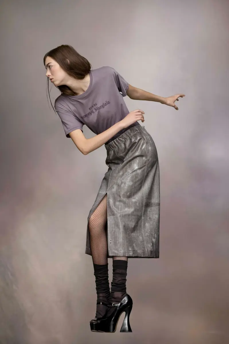 La camiseta de jersey de algodón luce el nuevo logotipo invertido, con una puntada invertida que da la impresión de haber sido cosida y descosida. Las cuatro puntadas, el logo de Maison Margiela, aparecen en la espalda; lo opuesto a una etiqueta.