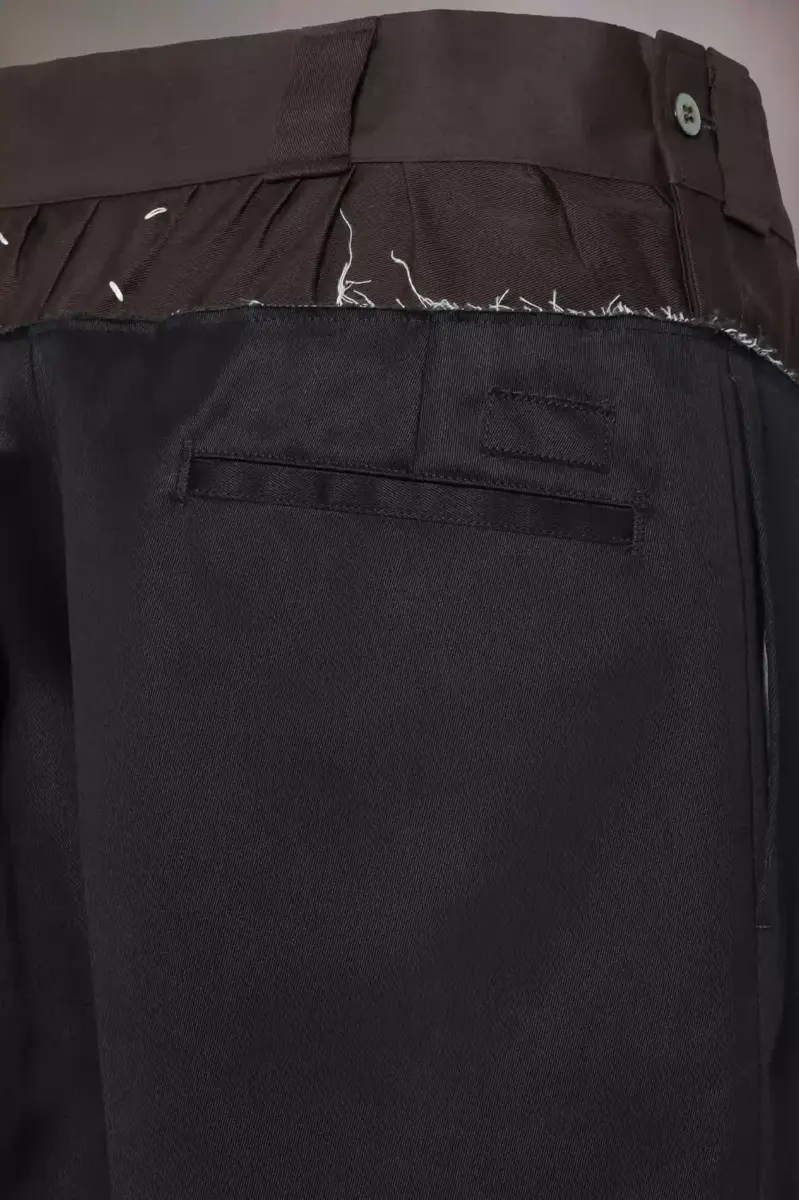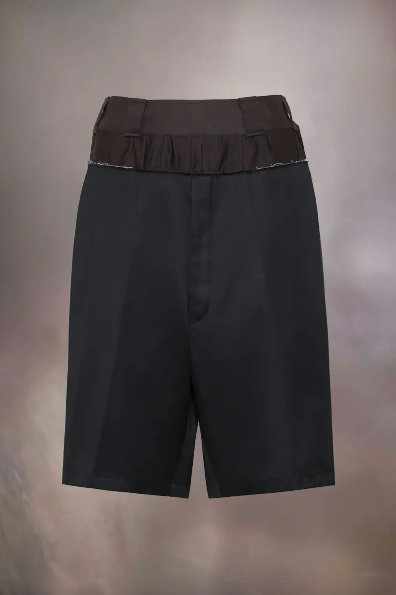 Los shorts hasta la rodilla proponen una nueva perspectiva del vestuario masculino, con una cintura sin rematar que revela un tejido fruncido en contraste entre la cinturilla, explorando la anonimato del concepto de forro. Se completan con trabillas y bolsillos traseros. El distintivo de Maison Margiela, las cuatro puntadas, aparece en la espalda; lo opuesto a una etiqueta.