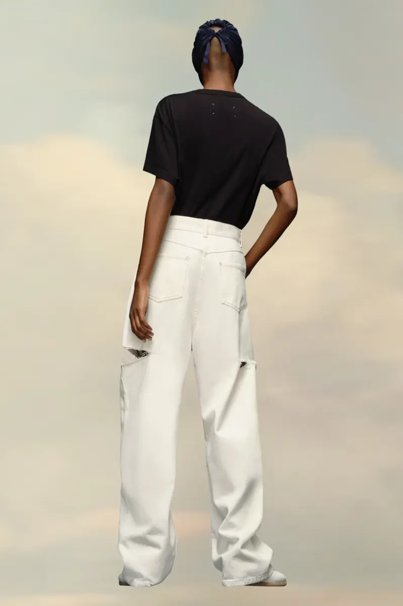 Vaqueros holgados, ajustados en la cintura y voluminosos en las perneras rectas, con un corte irregular que deja ver el tejido deshilachado en los cortes de los muslos. Están confeccionados en algodón y tienen cinco bolsillos.
