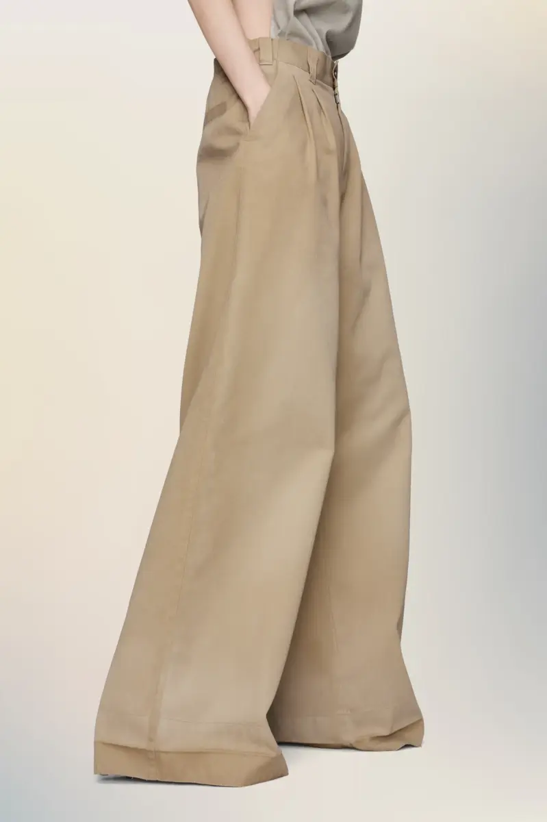 Los pantalones chinos skater de pernera ancha presentan cintura alta con pliegues y el gancho de Margiela. La espalda es elástica y cuenta con bolsillos de ribete. En el bajo, la técnica Memory of muestra líneas de pliegue sutilmente visibles, aportando un toque desgastado a una silueta moderna. Las cuatro puntadas, el sello distintivo de Maison Margiela, aparecen en la espalda; lo opuesto a una etiqueta.