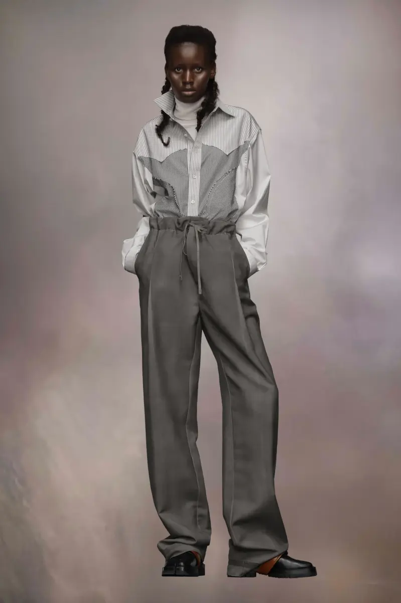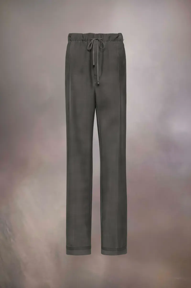 Confeccionados en mohair de lana, estos pantalones lucen las puntadas Work-in-Progress de la Maison en la cintura. El cordón informal contrasta con elegantes pliegues. Presentan una técnica de pátina grasa aplicada a mano para un aspecto desgastado. Las cuatro puntadas, insignia de Maison Margiela, aparecen en la espalda; lo opuesto a una etiqueta.