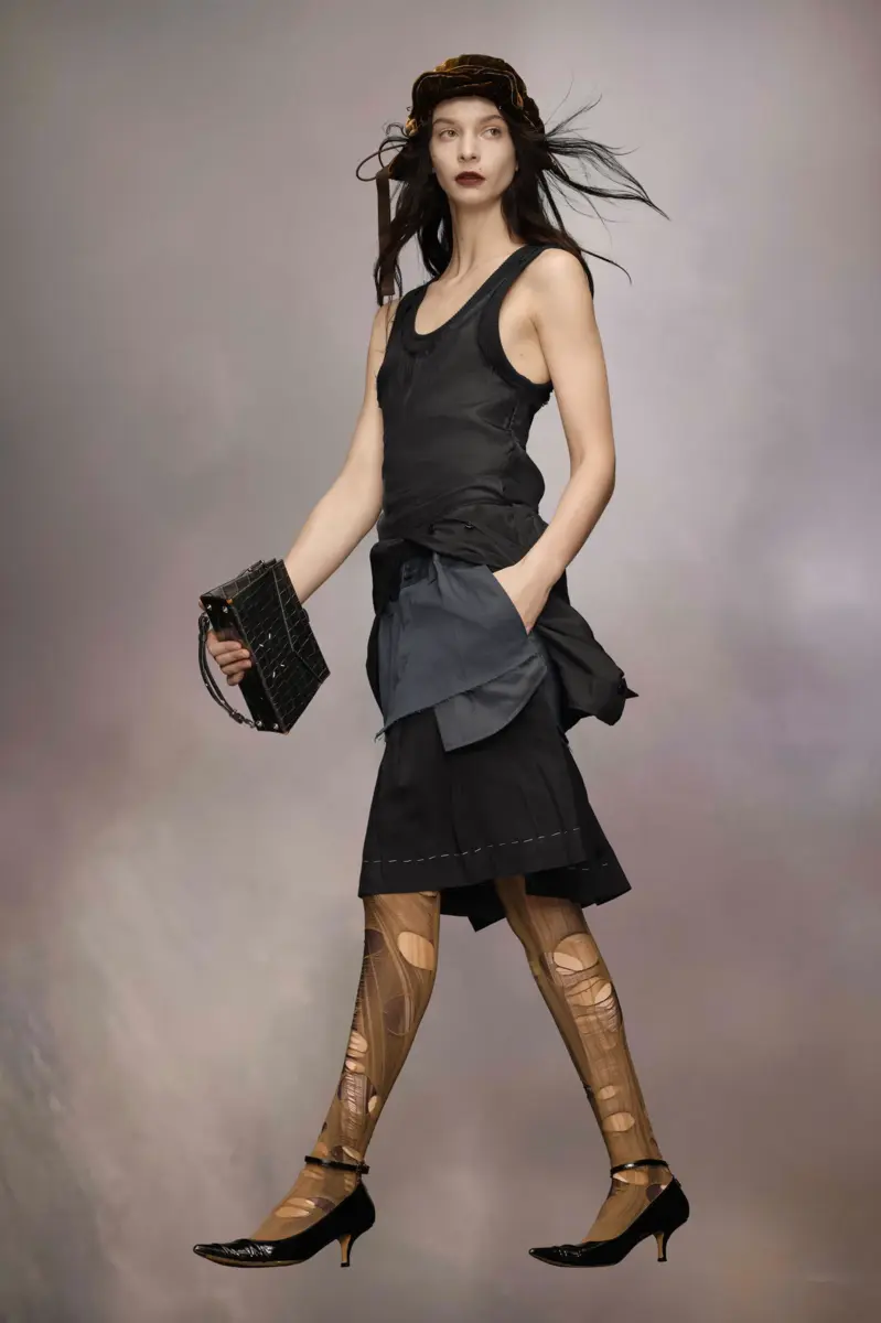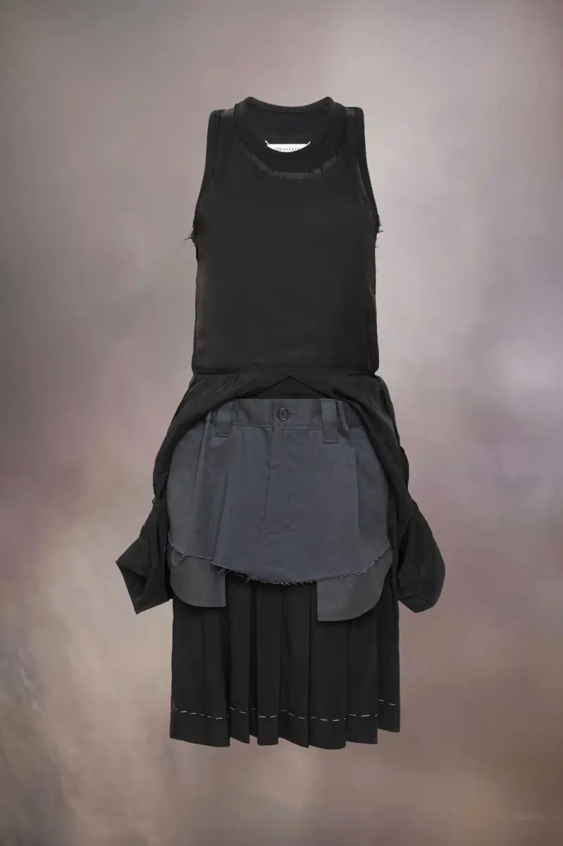 Una auténtica experimentación con la técnica de forro de la Maison, el vestido de viscosa y algodón exhibe capas al descubierto. La primera falda tiene un corte a la rodilla con puntadas en proceso alrededor del bajo, y una segunda capa se abre para revelar los bolsillos. La tercera capa, una camisa retrabajada, crea una silueta exagerada, mientras que la parte superior del vestido presenta un escote redondo de doble capa. Las cuatro puntadas, el sello distintivo de Maison Margiela, aparecen en la espalda. Lo opuesto a una etiqueta.