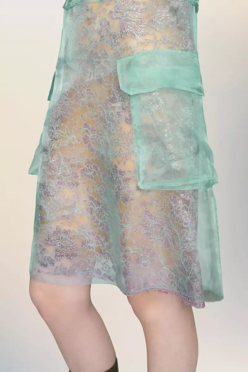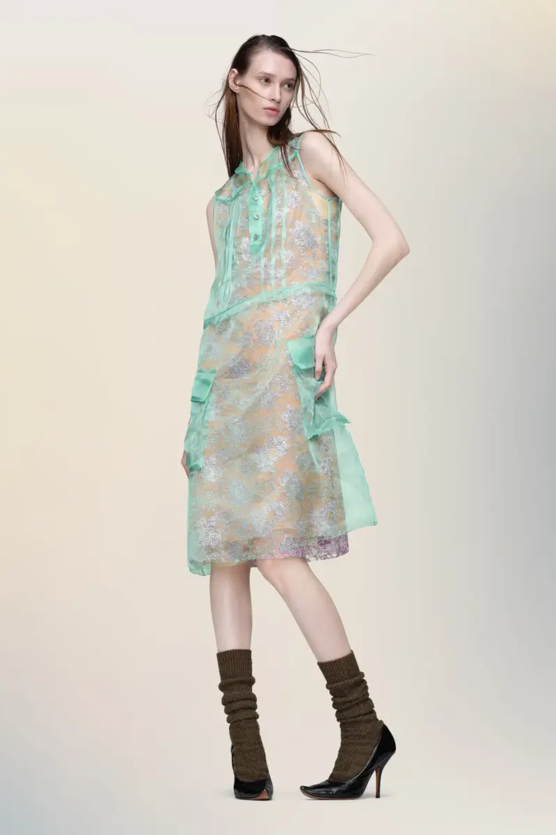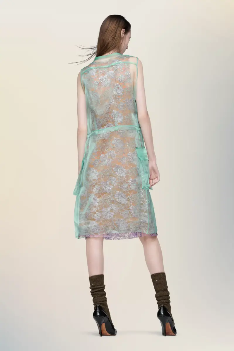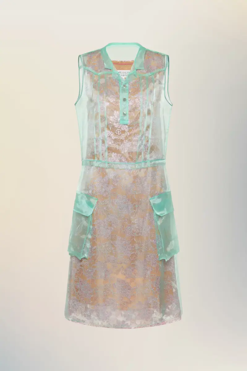 Maison Margiela reinterpreta el vestido de té como un estudio de capas de luz y textura. Originalmente usado para el té de la tarde entre las décadas de 1920 y 1940, la tela transparente flota sobre la prenda, revelando su confección y cambiando la percepción de suavidad. Los bolsillos de parche y los detalles de botones le otorgan una sutil sensación de uniformidad. Las cuatro puntadas aparecen en la espalda. Lo opuesto a una etiqueta.