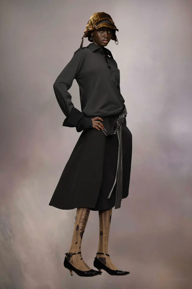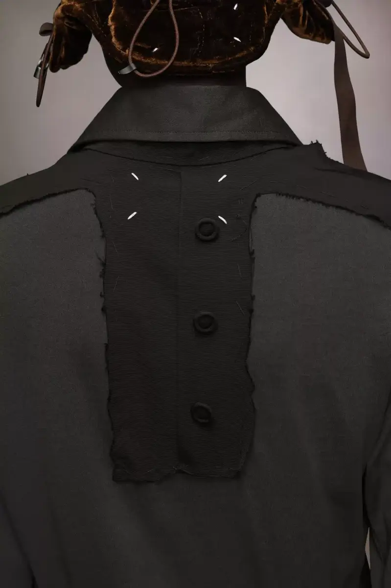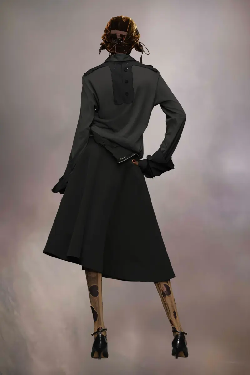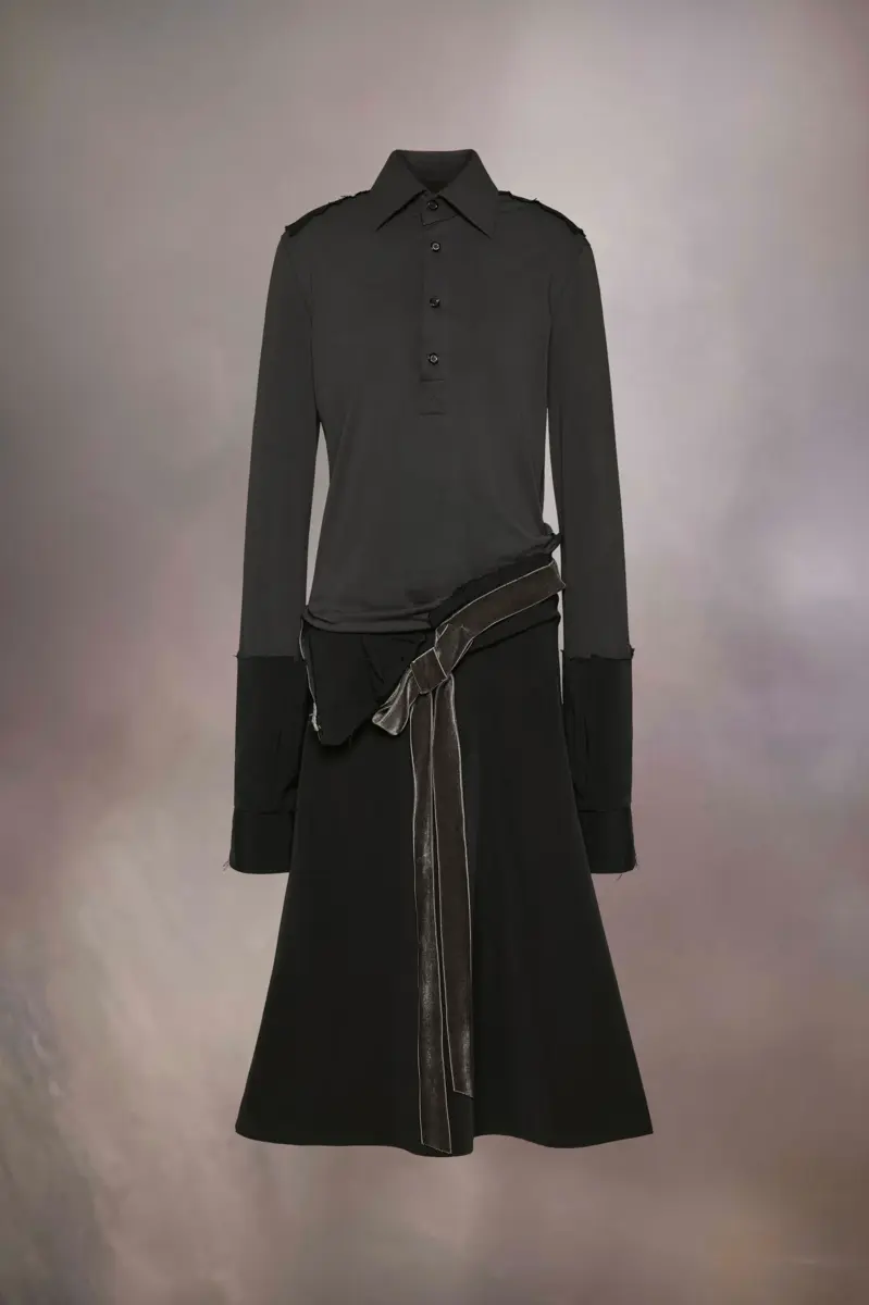 Representando el estilo «work in progress» característico de la Maison, este vestido camisero midi está confeccionado en algodón y viscosa, creando una distintiva silueta de cintura baja con detalles desgastados para un look sin rematar. Presenta cuello alto con cierre de botones, mangas largas y una cinturilla de corte diagonal formada por la falda. El volumen se introduce mediante puños en contraste que juegan con las proporciones. Detalles de décortiqué adornan la espalda, mientras que un largo lazo interrumpe la parte delantera.