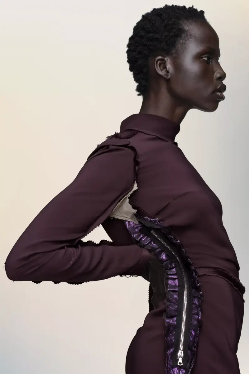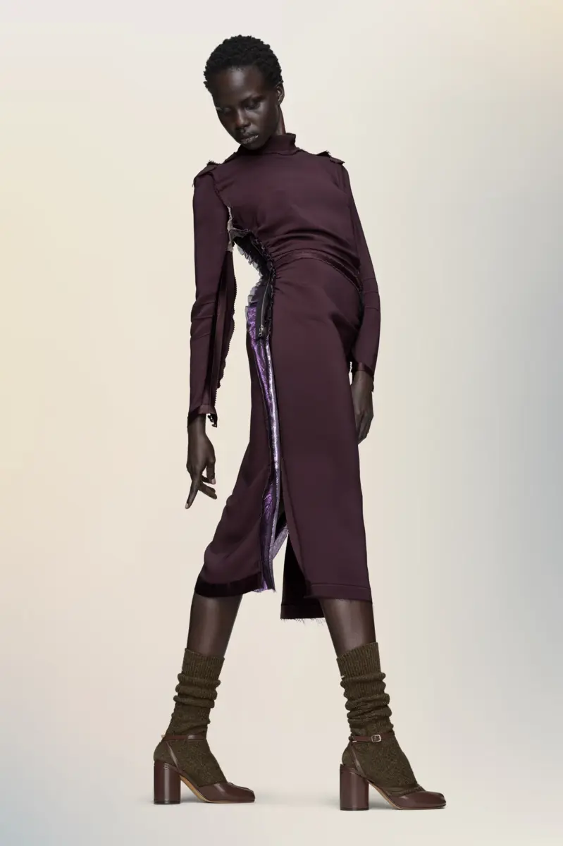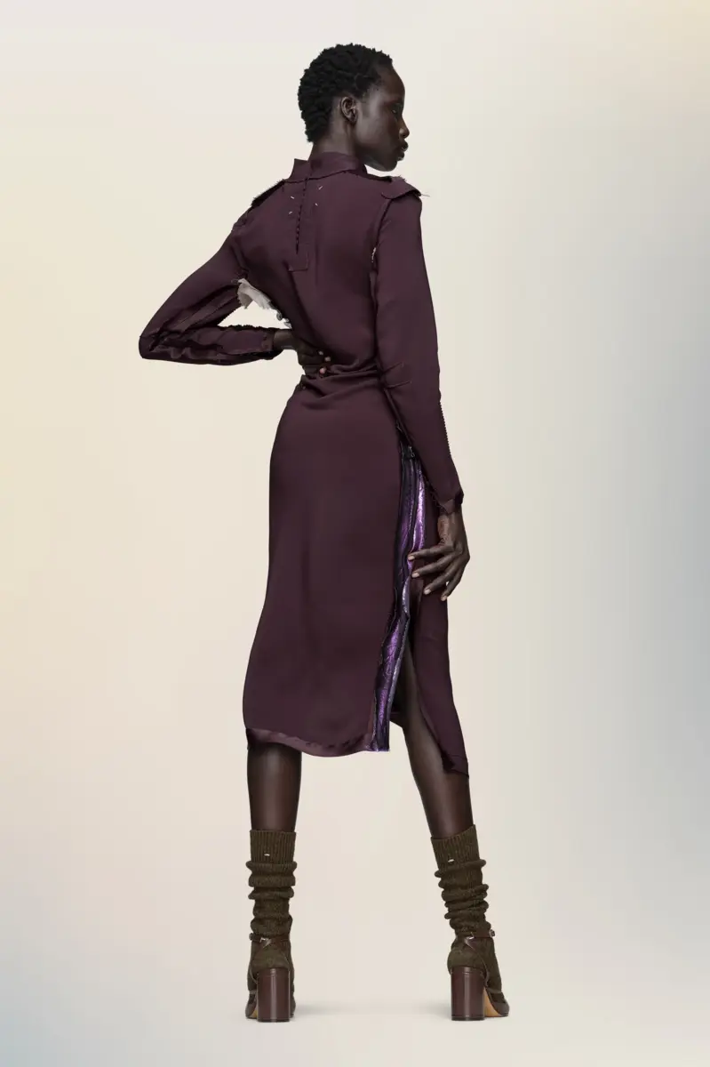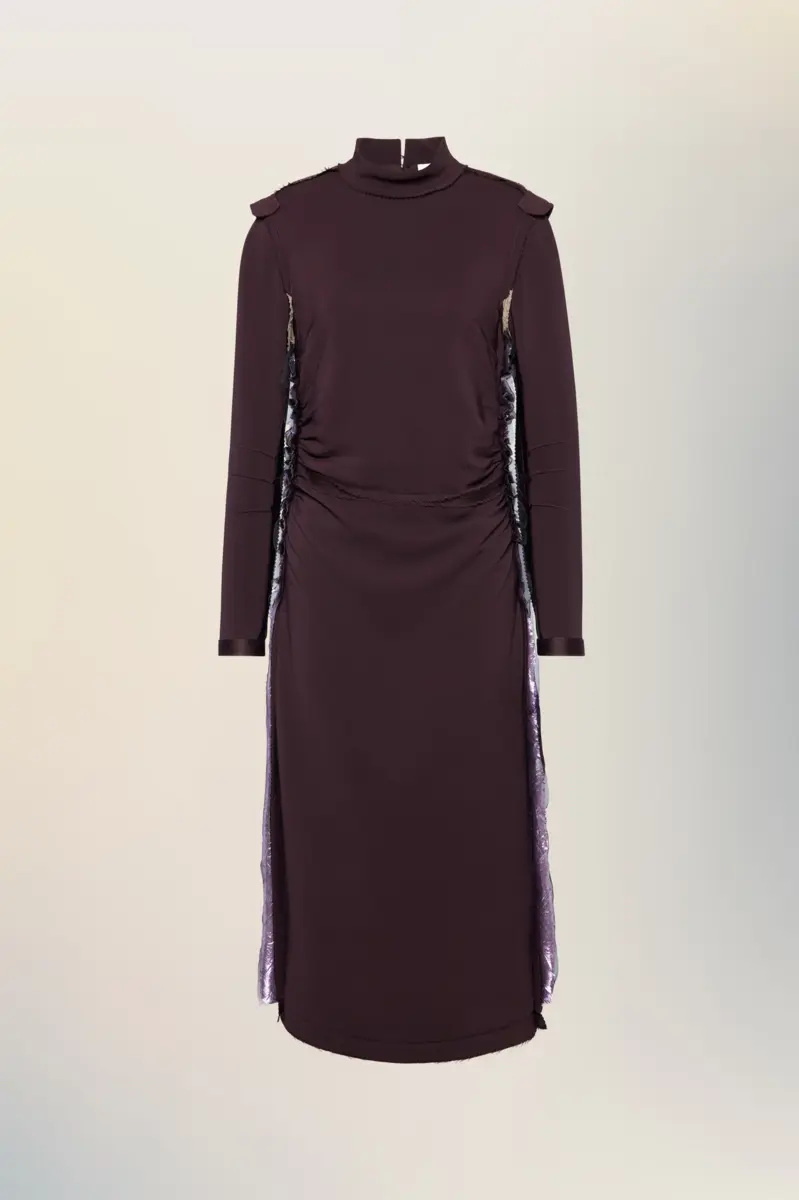 Con una silueta esculpida, este vestido de manga larga revela destellos de lamé metálico en las costuras laterales. Un suave fruncido a lo largo del cuerpo realza la figura, mientras que las texturas en contraste añaden una sutil dimensión. Las cuatro puntadas, el sello distintivo de Maison Margiela, aparecen en la espalda; lo opuesto a una etiqueta.