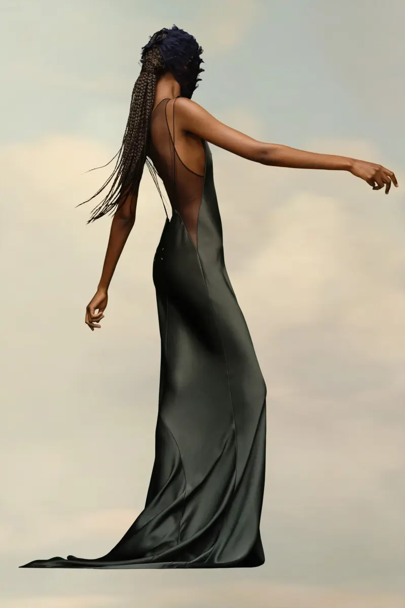 En satén martillado, este vestido largo, que se extiende hasta el suelo, presenta un diseño sin mangas con cuello barco. Luce paneles transparentes en el pecho y la espalda, con una amplia abertura. Está rematado con cuatro puntadas blancas que muestran la firma de la Maison: lo contrario de una etiqueta.