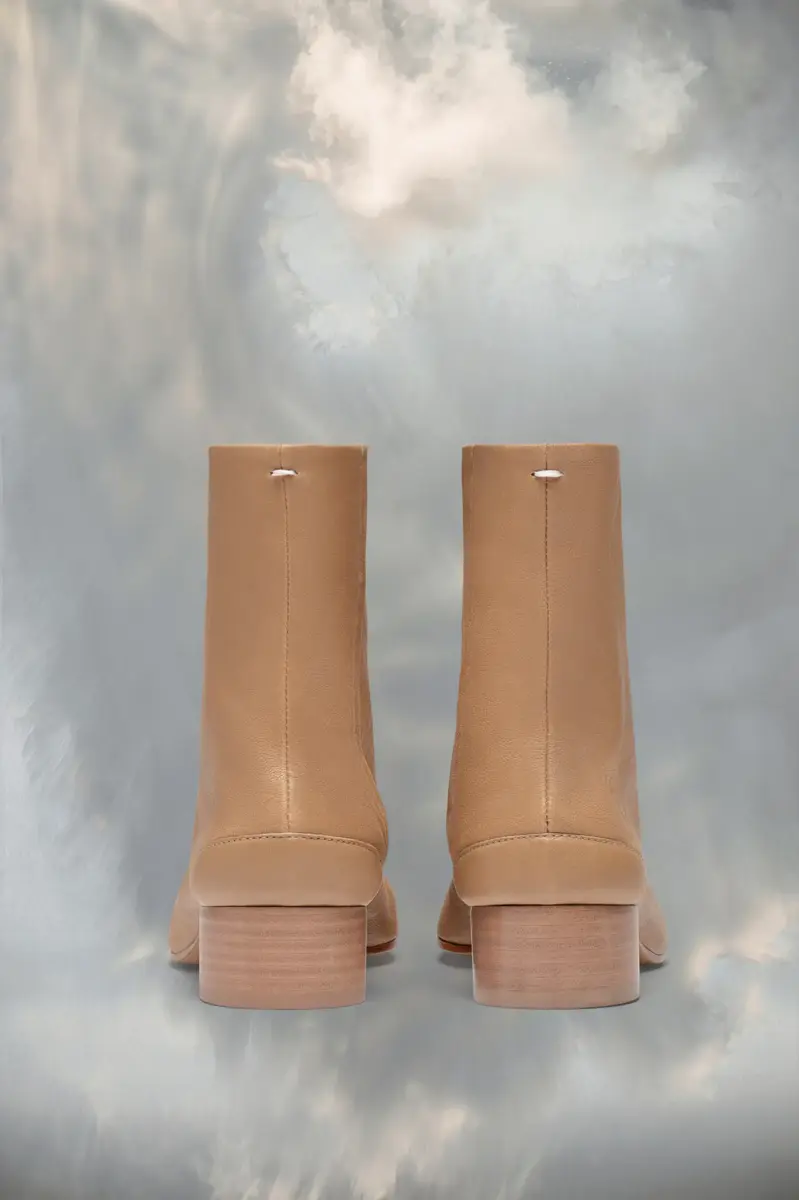 Elaborados en suave piel de napa, estos botines presentan un tacón cilíndrico de 3 cm y la forma Tabi de punta dividida, inspirada en el tradicional calcetín japonés del siglo XV con el mismo nombre, lanzado para la colección debut de la Maison en 1989. Captura el espíritu vanguardista e insubordinado de la Maison y existe como un clásico heredado, continuamente explorado en cada colección.