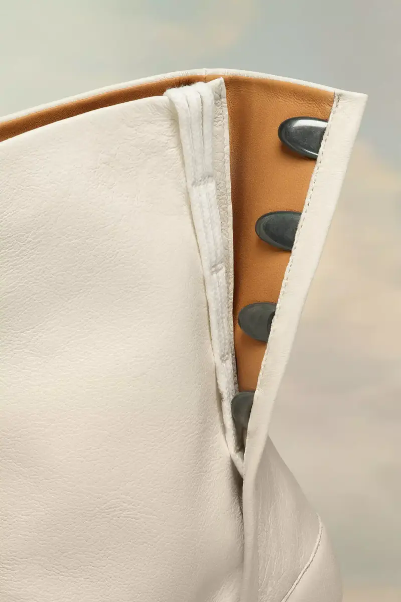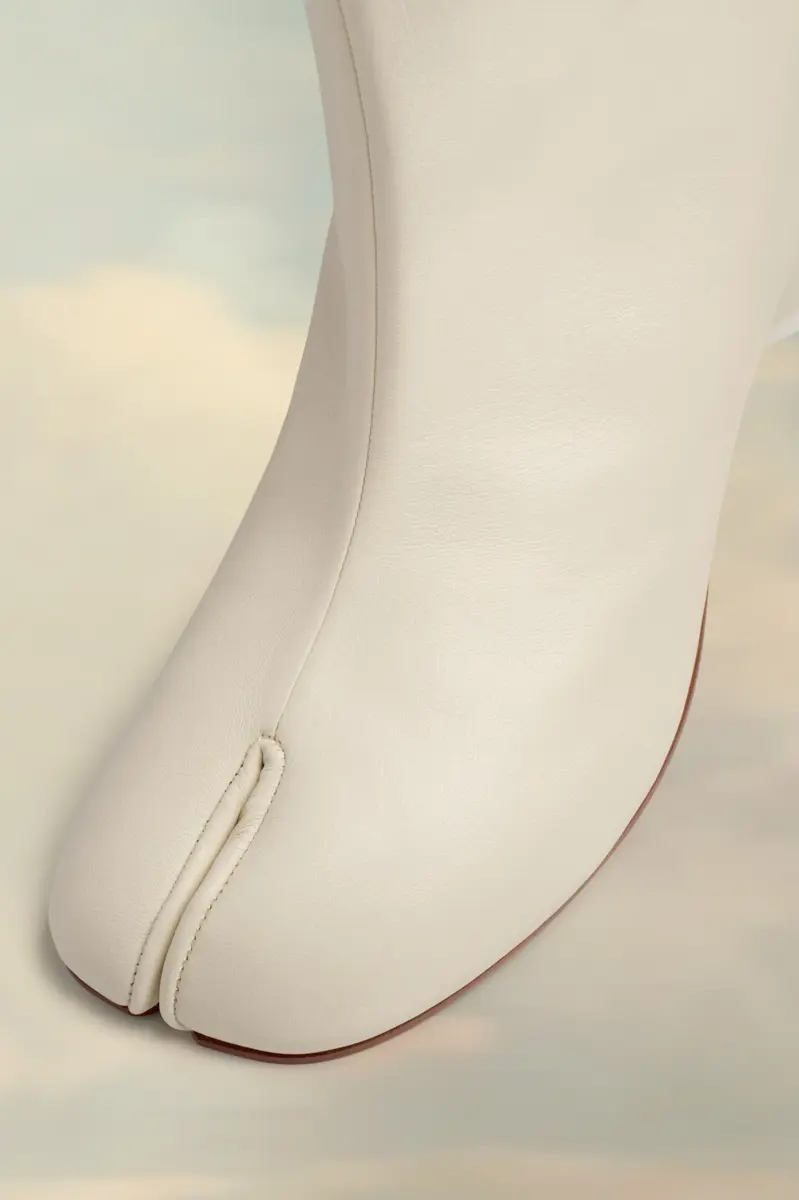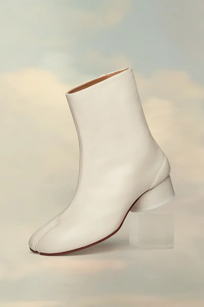 Elaborados en suave piel de napa, estos botines presentan un tacón cilíndrico de 3 cm y la forma Tabi de punta dividida, inspirada en el tradicional calcetín japonés del siglo XV con el mismo nombre, lanzado para la colección debut de la Maison en 1989. Captura el espíritu vanguardista e insubordinado de la Maison y existe como un clásico heredado, continuamente explorado en cada colección.