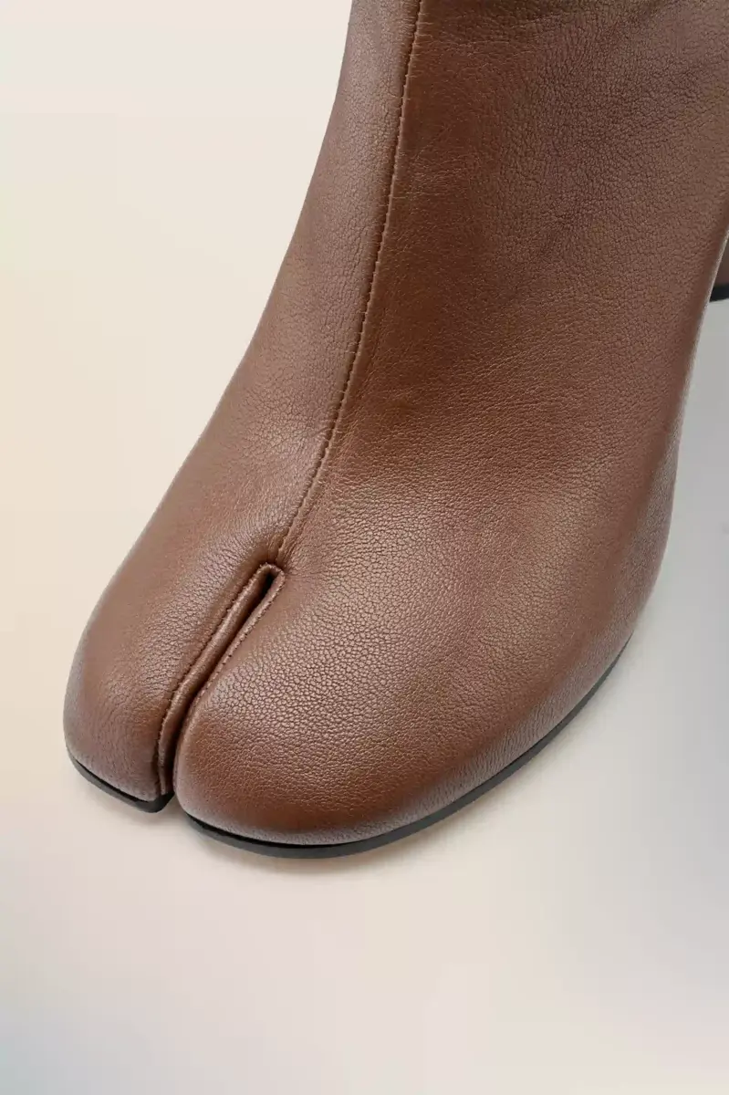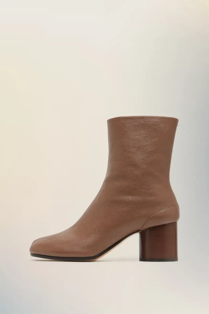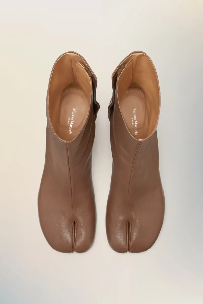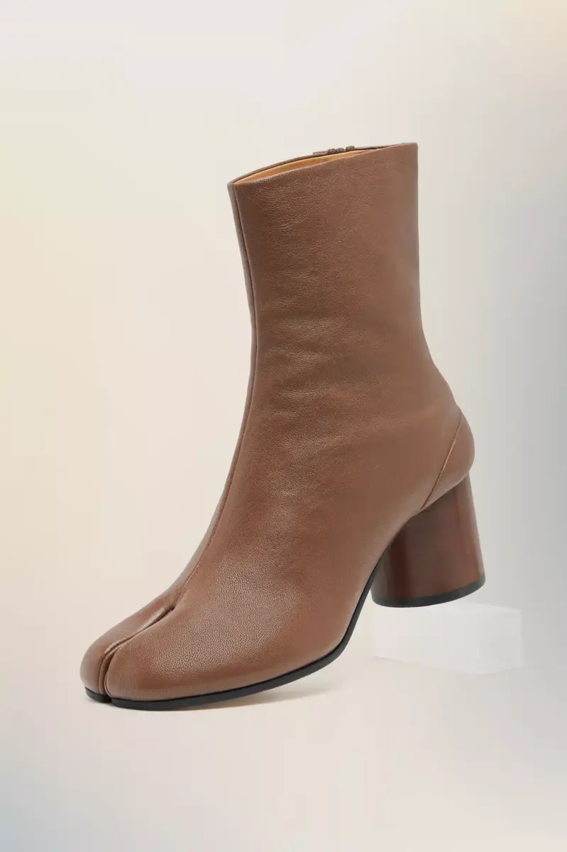 Elaborados en suave piel de napa, estos botines presentan un tacón cilíndrico de 6 cm y la forma Tabi de punta dividida, inspirada en el tradicional calcetín japonés del siglo XV con el mismo nombre, lanzado para la colección debut de la Maison en 1989. Captura el espíritu vanguardista e insubordinado de la Maison y existe como un clásico heredado, continuamente explorado en cada colección.