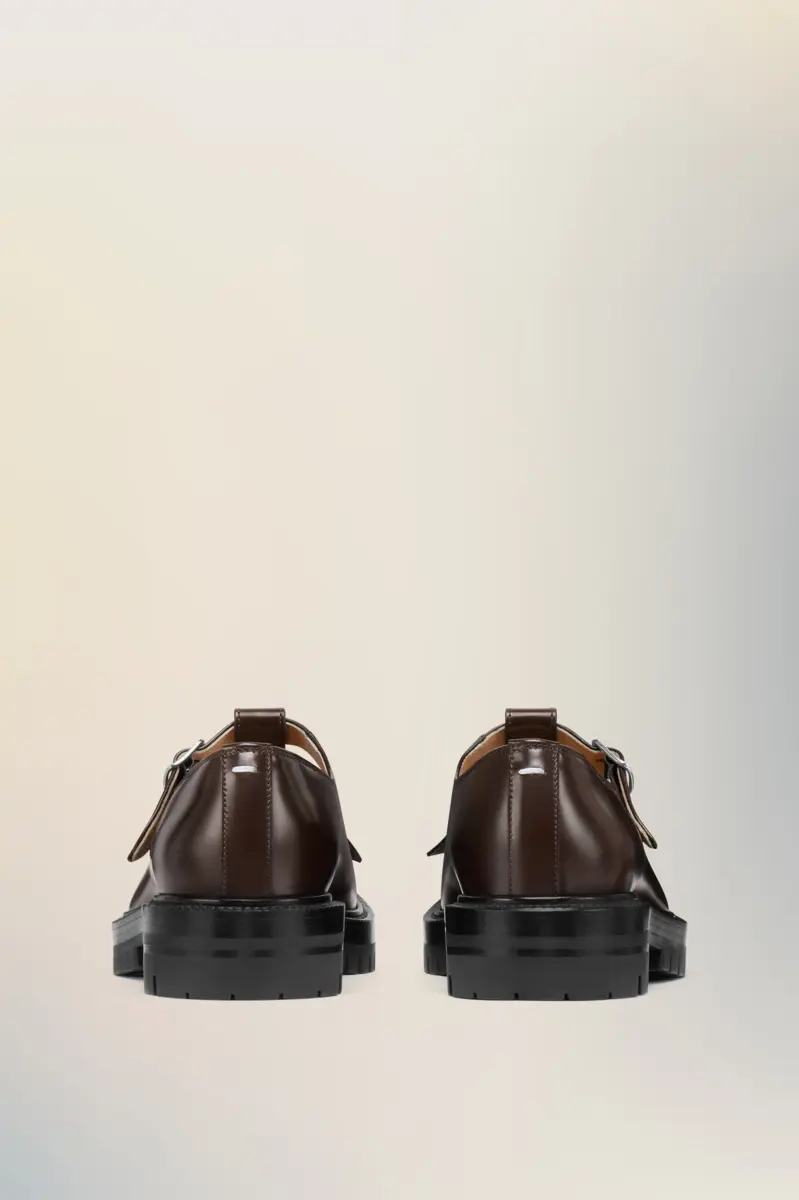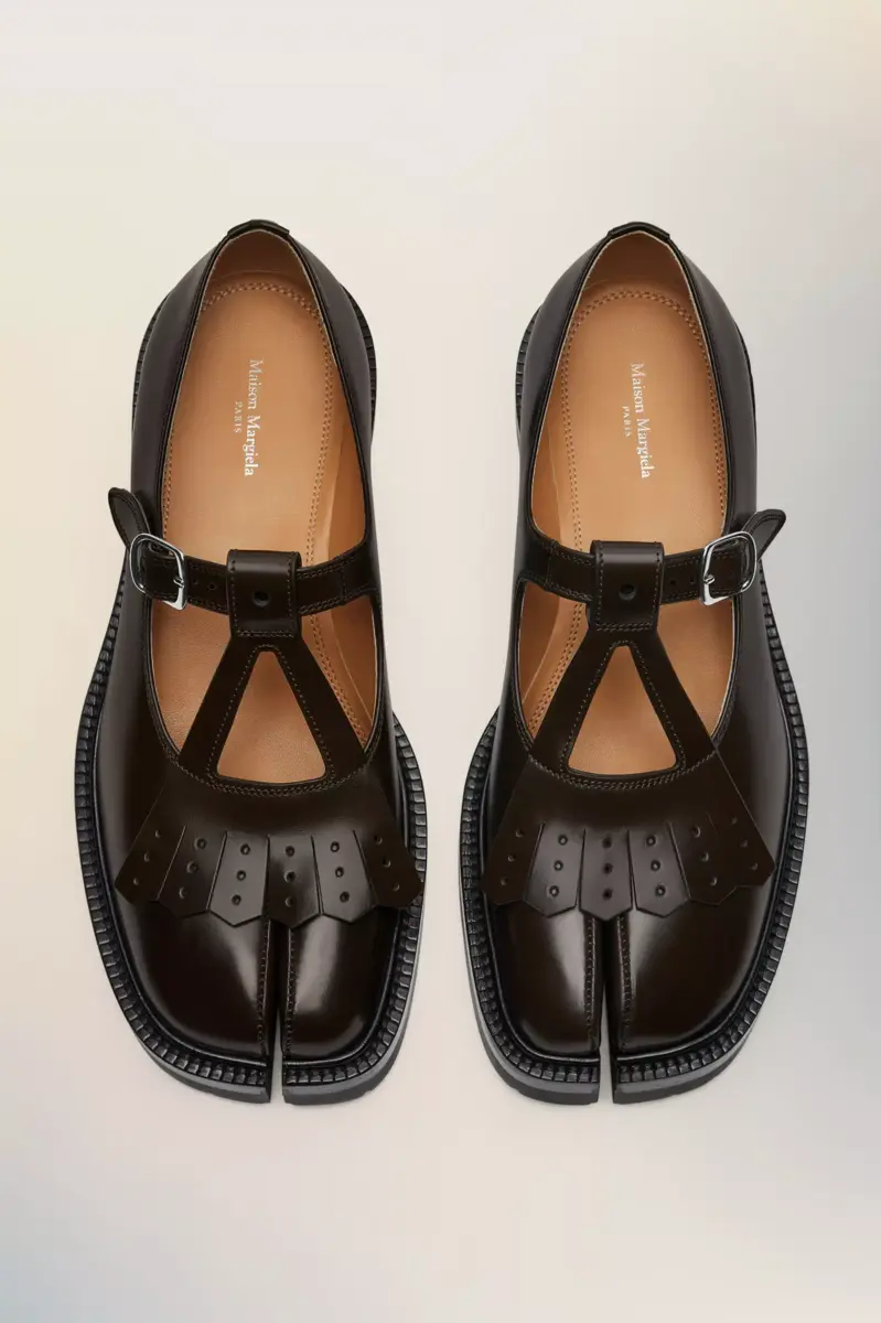 Con una suela con tacos y una decoración de flecos en la parte delantera, los zapatos Mary-Jane están elaborados en cuero cepillado. El par presenta la puntera dividida Tabi, inspirada en el tradicional calcetín japonés del siglo XV que lleva el mismo nombre, lanzado para la colección debut de la Maison en 1989. Captura el espíritu vanguardista e insubordinado de la Maison y existe como un clásico heredado, continuamente explorado a través de cada colección.