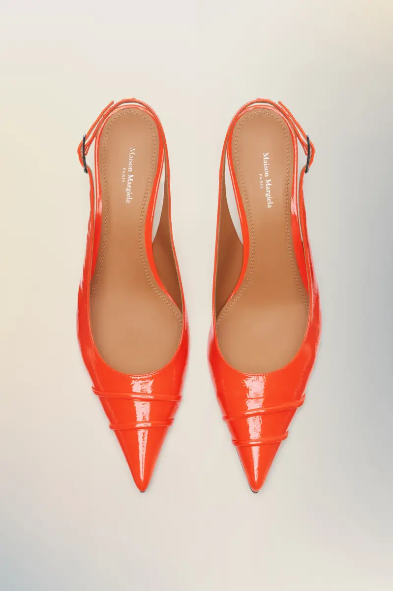 Los zapatos destalonados Kinkies de Maison ofrecen una nueva silueta femenina. Elaborados en suave charol, presentan pliegues hechos a mano que evocan el gesto del «recuerdo», evocando un movimiento pre-amado. Están reforzados con goma en la puntera para una mayor durabilidad y cuentan con un tacón de 5,5 cm. La puntada distintiva de Maison Margiela aparece en la parte trasera.