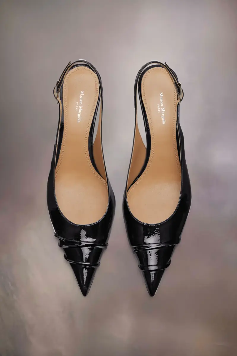 Los zapatos destalonados Kinkies de Maison ofrecen una nueva silueta femenina. Elaborados en suave charol, presentan pliegues hechos a mano que evocan el gesto del «recuerdo», evocando un movimiento pre-amado. Están reforzados con goma en la puntera para una mayor durabilidad y cuentan con un tacón de 5,5 cm. La puntada distintiva de Maison Margiela aparece en la parte trasera.
