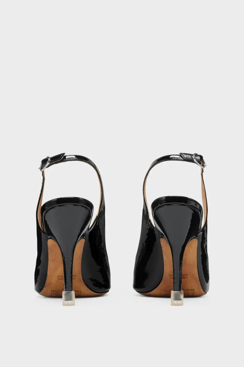 El zapato destalonado Loved to Death está confeccionado en charol brillante de cabra, con detalles moldeados a mano que imitan las marcas del uso natural. Su silueta estructurada se define por un pliegue ascendente en la puntera, mientras que la suela de piel de becerro está barnizada a mano y ligeramente lijada para darle un aspecto desgastado. La distintiva puntada blanca de Maison Margiela aparece en la parte trasera.