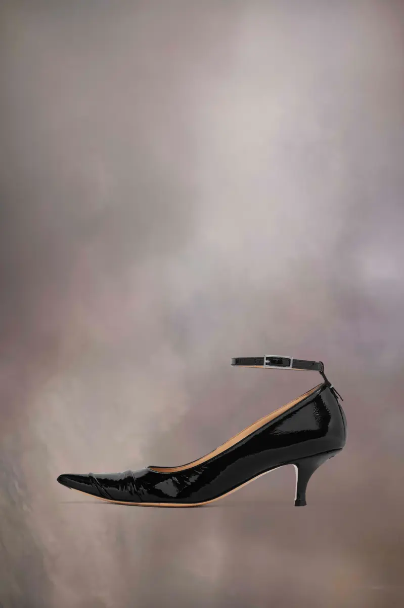 Representando lo inusual o excéntrico, el salón Kinkies de Maison es una nueva silueta femenina con un toque punk. Elaborado en piel de cordero flexible, con una textura suave y ligeramente abultada, junto con su acabado de charol, este salón presenta pliegues hechos a mano que le dan un toque lujoso y un tacón de 5,5 cm. Están reforzados con goma en la puntera para una mayor durabilidad y se completan con una correa ajustable en el tobillo. La puntada distintiva de Maison Margiela aparece en la parte trasera. Lo opuesto a una etiqueta.