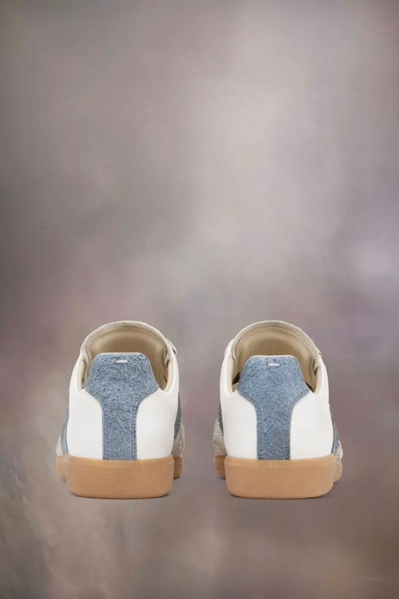 Las zapatillas Replica, de piel de becerro y ante con tratamiento vintage, se apoyan en una clásica suela de goma. El icónico modelo Replica de la Maison se inspira en el calzado deportivo austriaco de los años setenta. Los detalles de las Replica se renuevan continuamente según las inspiraciones de la temporada. La característica puntada blanca de Maison Margiela aparece en la parte trasera.