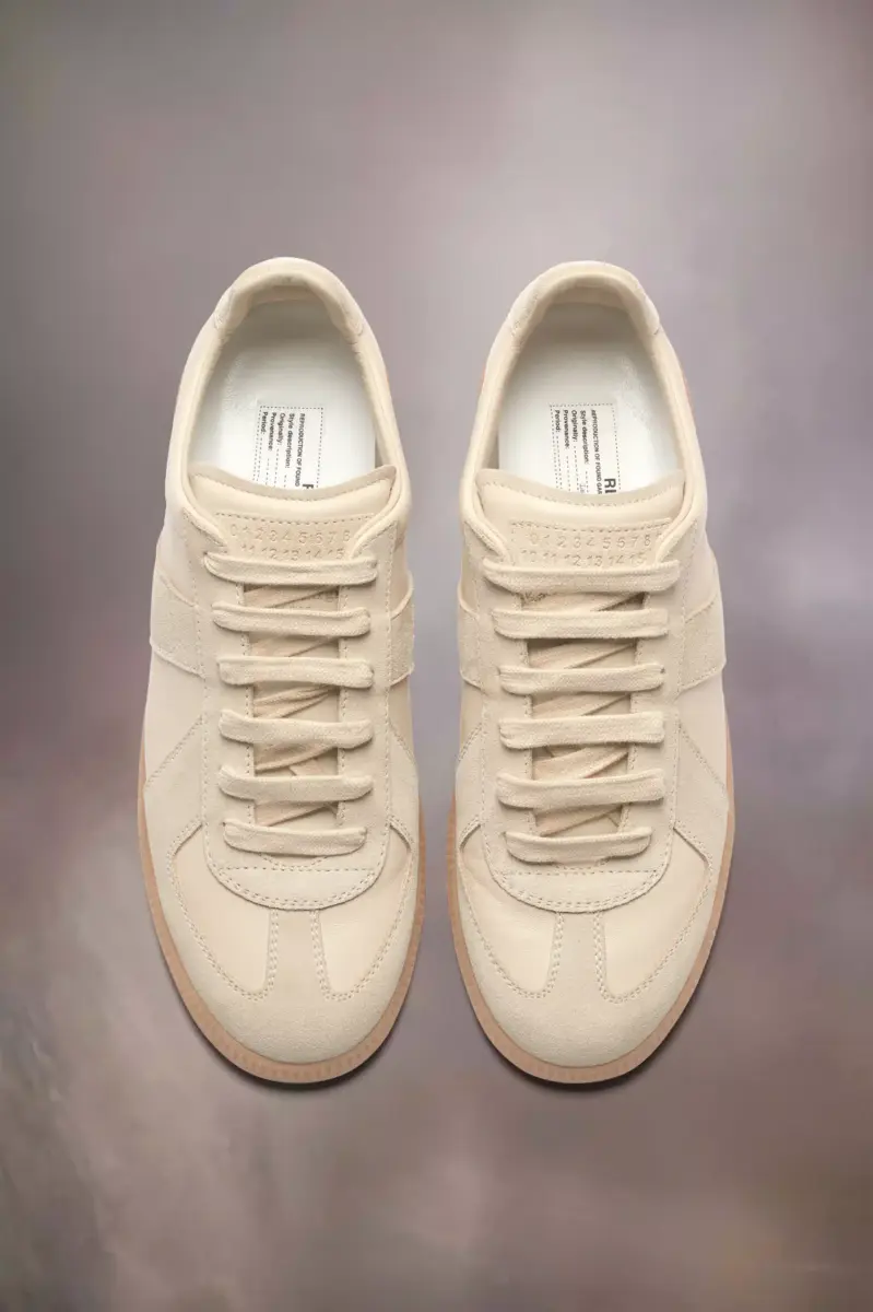 Las zapatillas Replica de napa y ante con suela color miel. Las icónicas zapatillas Replica de la Maison están inspiradas en el calzado deportivo austriaco de los años setenta. Los detalles de los modelos Replica se renuevan continuamente según las inspiraciones de la temporada.